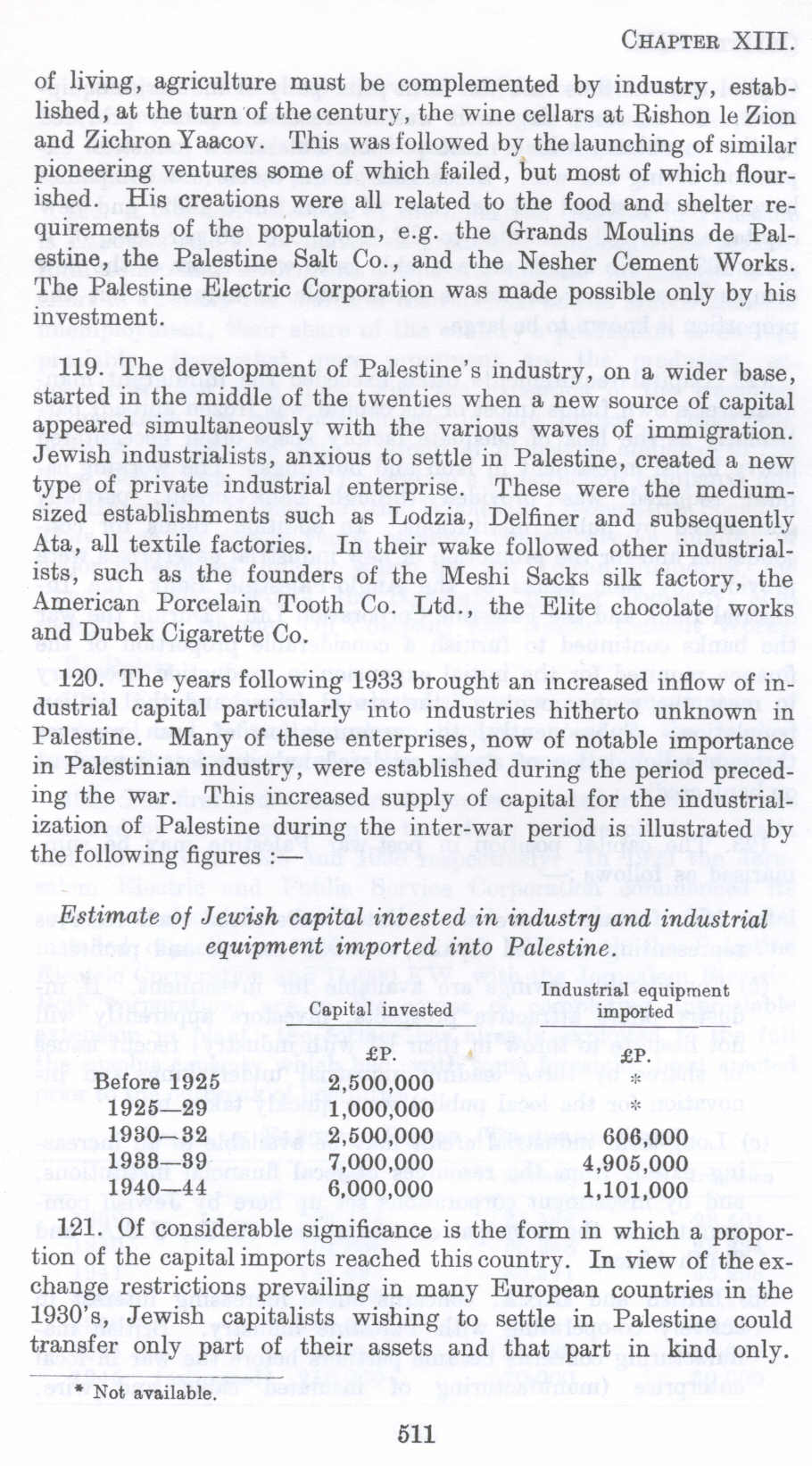 120. The years following 1933 brought an increased inflow of industrial capital particularly into industries hitherto unknown in Palestine. Many of these enterprises, now of notable importance in Palestinian industry, were established during the period preceding the war. This increased supply of capital for the industrialization of Palestine during the inter-war period is illustrated by the following figures :-