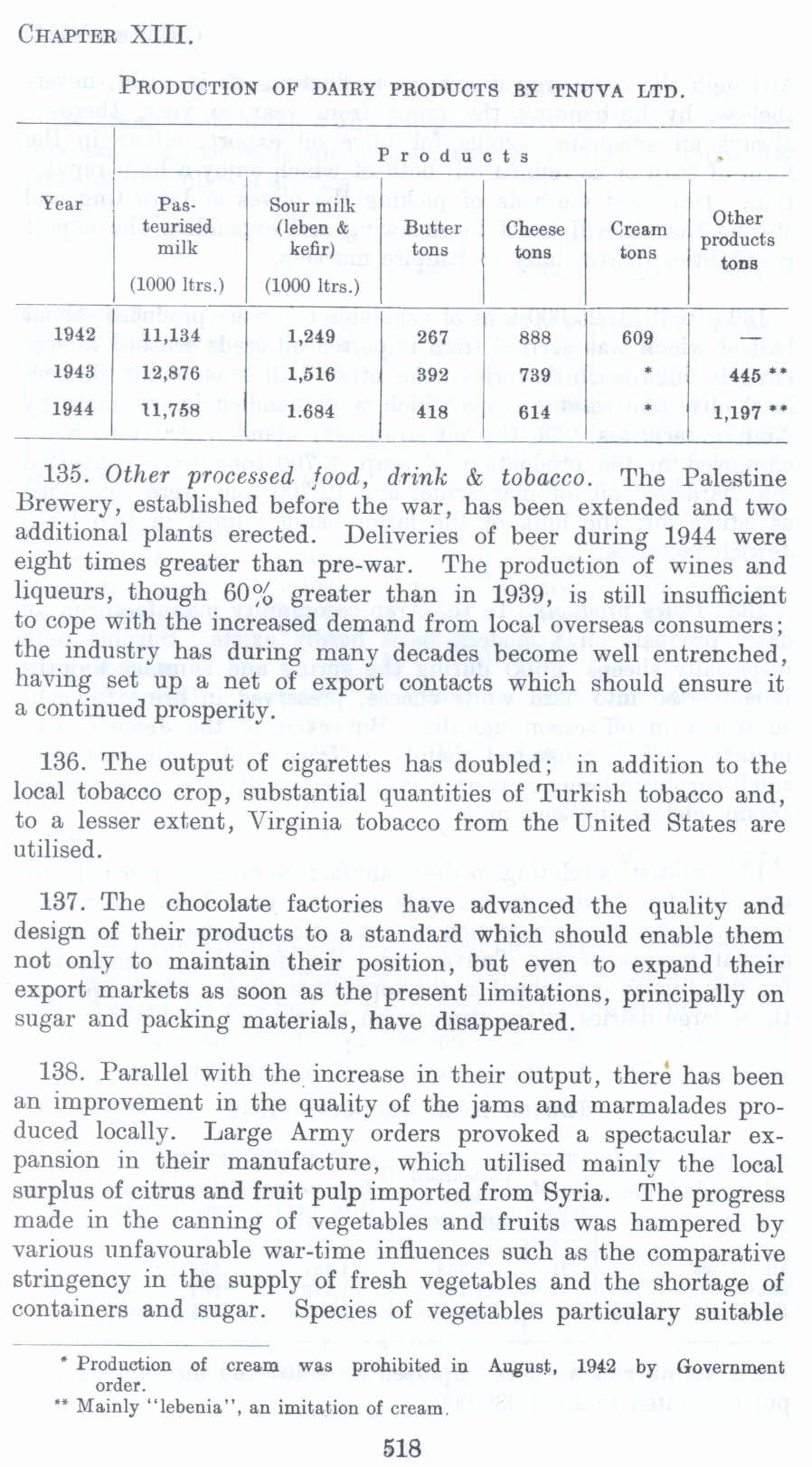 A Survey of Palestinian Industry: Production of Dairy Products By Tnuva Ltd. & other processed food and tobacco in Palestine before 1948 (Nakba), British Mandate: A Survey of Palestine: Volume I - Page 518. . Chapter XIII: Section 4: |