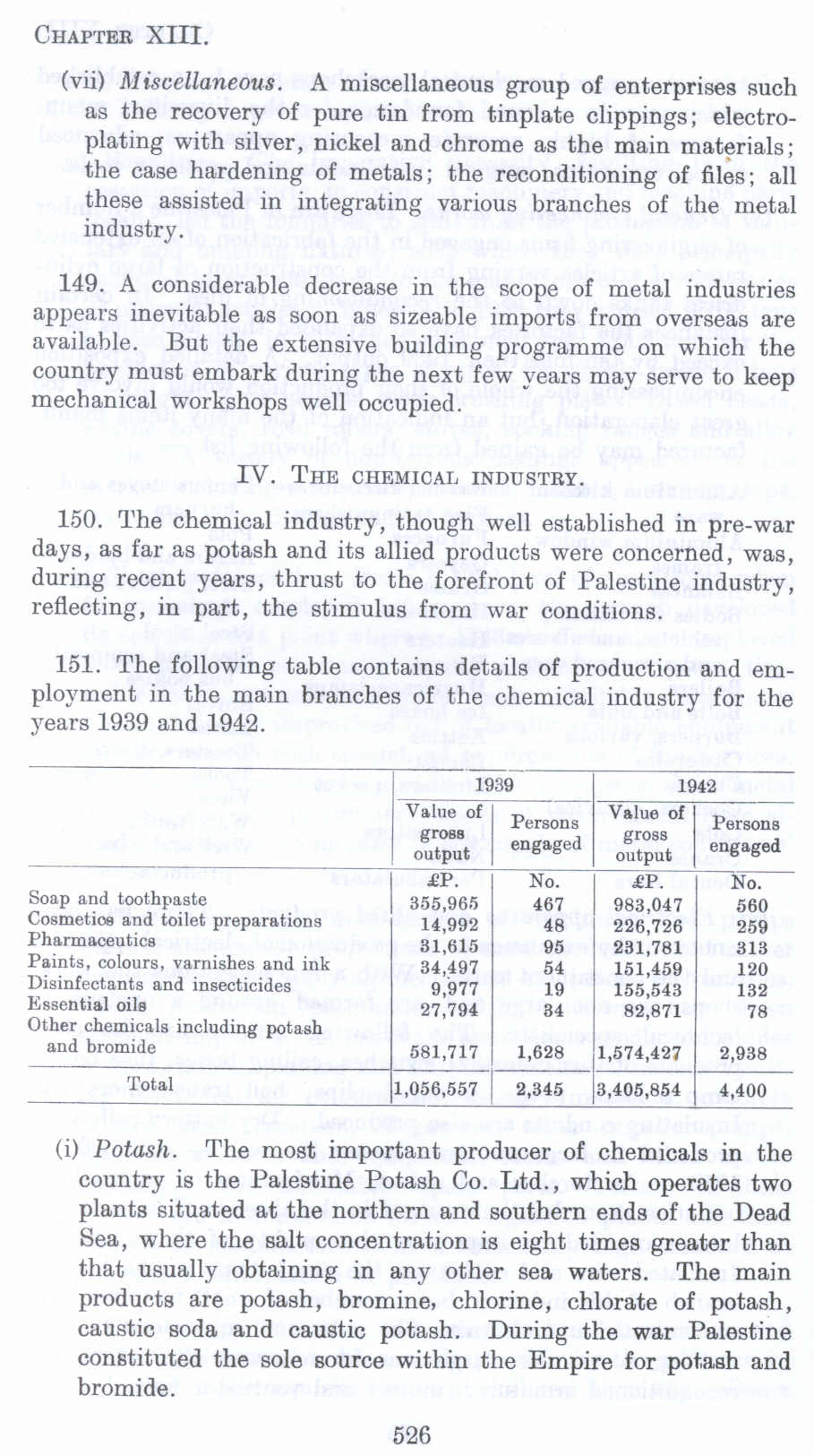 150. The chemical industry, though well established in pre-war days, as far as potash and its allied products were concerned, was, during recent years, thrust to the forefront of Palestine industry, reflecting, in part, the stimulus from war conditions.