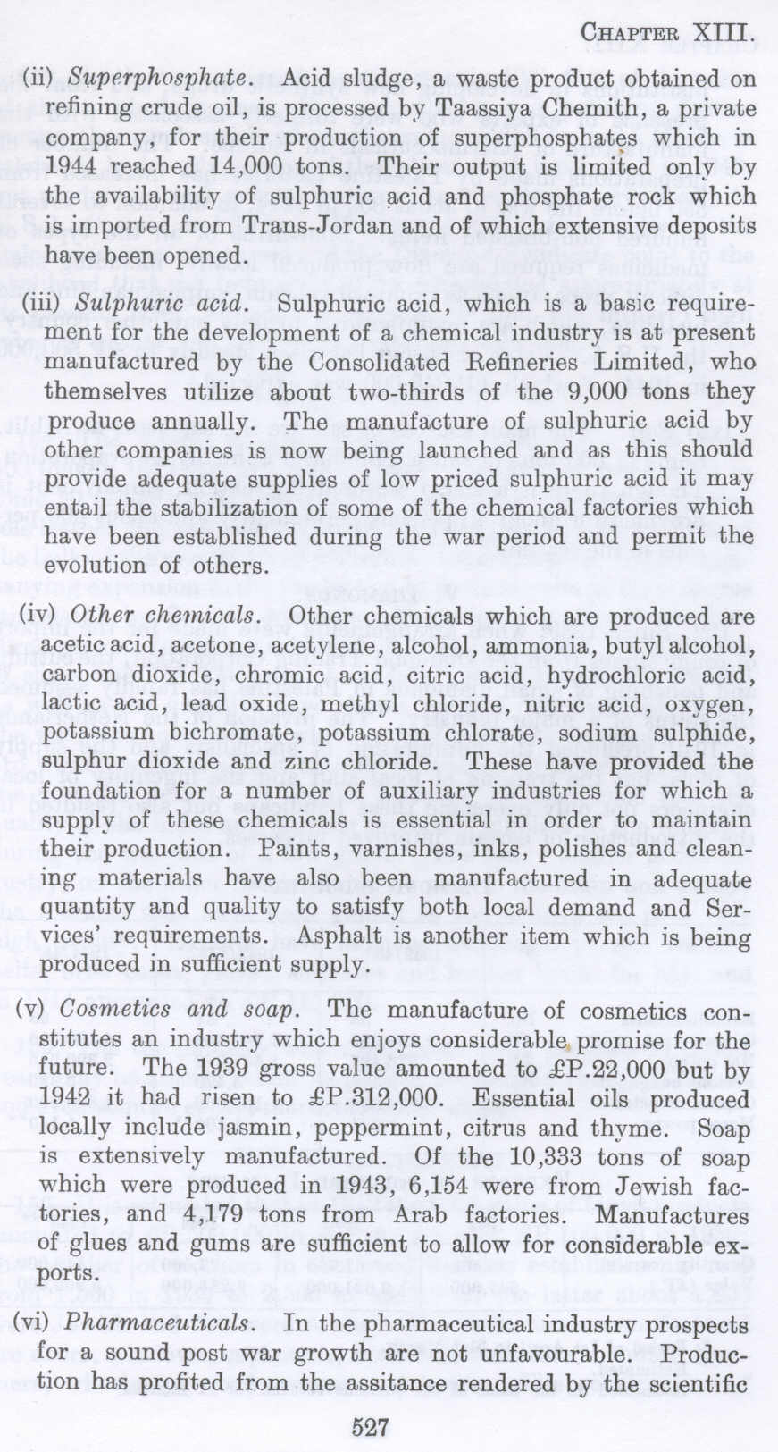 (ii) Superphosphate. Acid sludge, a waste product obtained on refining crude oil, is processed by Taassiya Chemith, a private company, for their production of superphosphates which in 1944 reached 14,000 tons. Their output is limited only by the availability of sulphuric acid and phosphate rock which is imported from Trans-Jordan and of which extensive deposits have been opened.