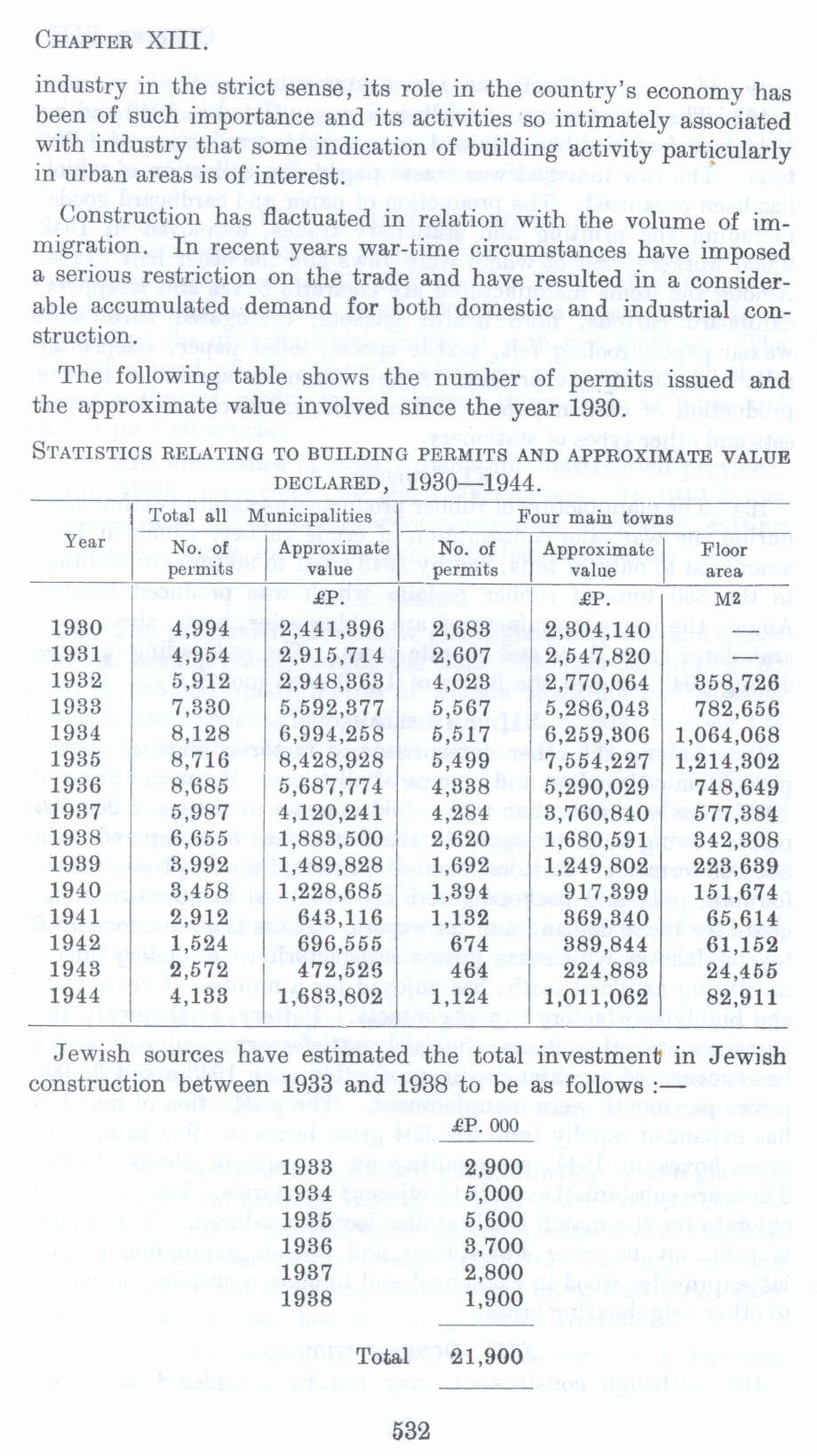 British Mandate: A Survey of Palestine: Volume I - Page 532. Chapter XIII: Section 4: A Survey of Industry: Statistics Relating to Building Permits And Approximate Value Declared, 1939 - 44 |