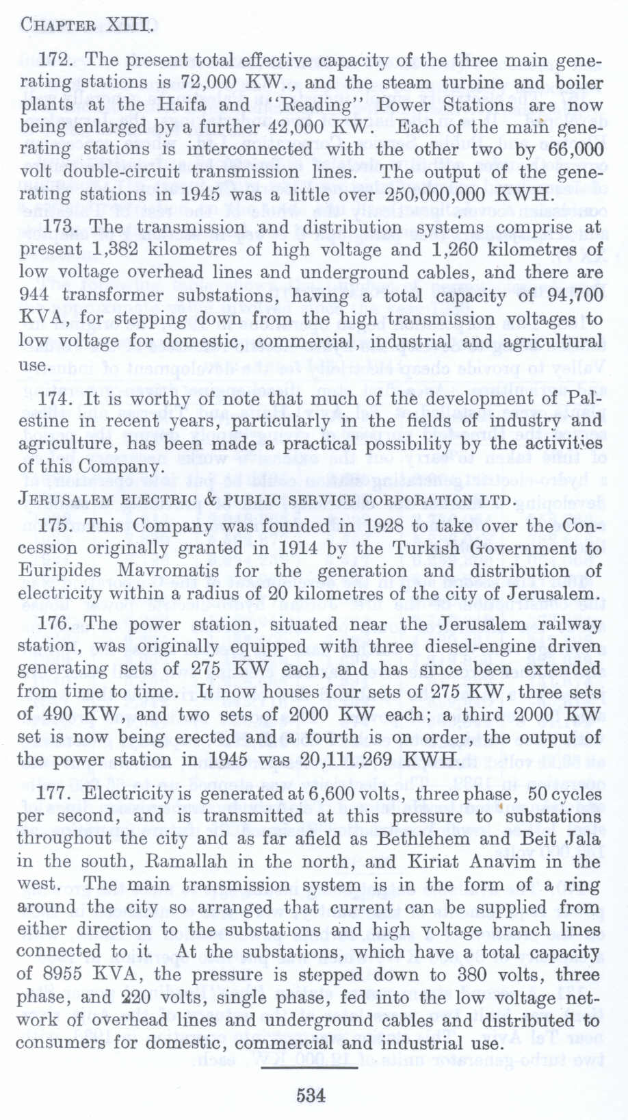 176. The power station, situated near the Jerusalem railway station, was originally equipped with three diesel-engine driven generating sets of 27 5 KW each, and has since been extended from time to time. It now houses four sets of 275 KW, three sets of 490 KW, and two sets of 2000 KW each; a third 2000 KW set is now being erected and a fourth is on order, the output of the power station in 1945 was 20,111,269 KWH.