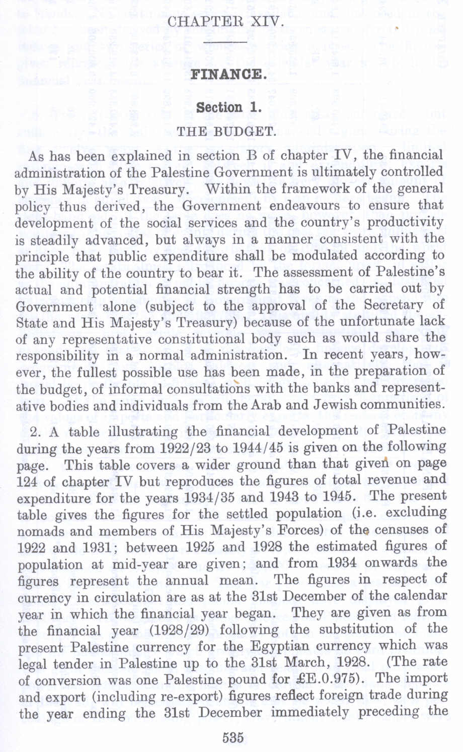 The Budget and Finance of Palestinian Government before 1948 (Nakba), British Mandate: A Survey of Palestine: Volume II - Page 535. Chapter XIV: Finance: Section 1: |