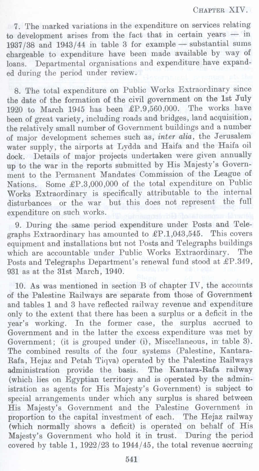 8. The total expenditure on Public Works Extraordinary since the date of the formation of the civil government on the 1st July 1920 to March 1945 has been £P. 9 ,560 ,000. The works have been of great variety, including roads and bridges, land acquisition, the relatively small number of Government buildings and a number of major development schemes such as, inter alia, the Jerusalem water supply, the airports at Lydda and Haifa and the Haifa oil dock. Details of major projects undertaken were given annually up to the war in the reports submitted by His Majesty's Government to the Permanent Mandates Commission of the League of Nations. Some £P.3,000,000 of the total expenditure on Public Works Extraordinary is specifically attributable to the internal disturbances or the war but this does not represent the full expenditure on such works.