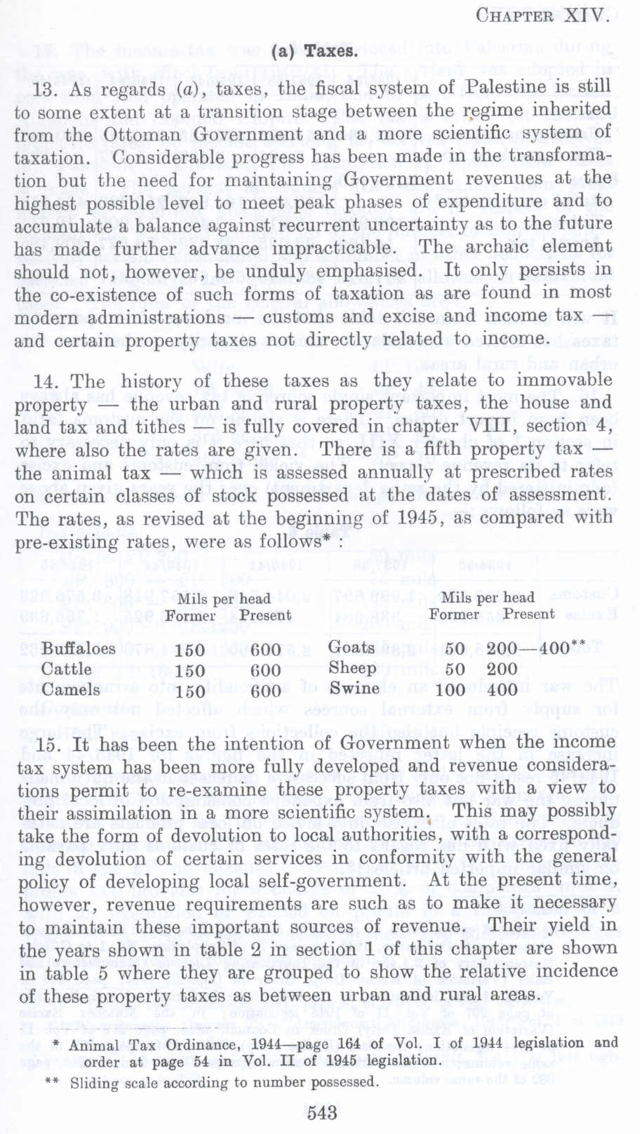 14. The history of these taxes as they relate to immovable property - the urban and rural property taxes, the house and land tax and tithes - is fully covered in chapter VIII, section 4, where also the rates are given. There is a fifth property tax - the animal tax - which is assessed annually at prescribed rates on certain classes of stock possessed at the dates of assessment. The rates, as revised at the beginning of 1945, as compared with pre-existing rates, were as follows*: