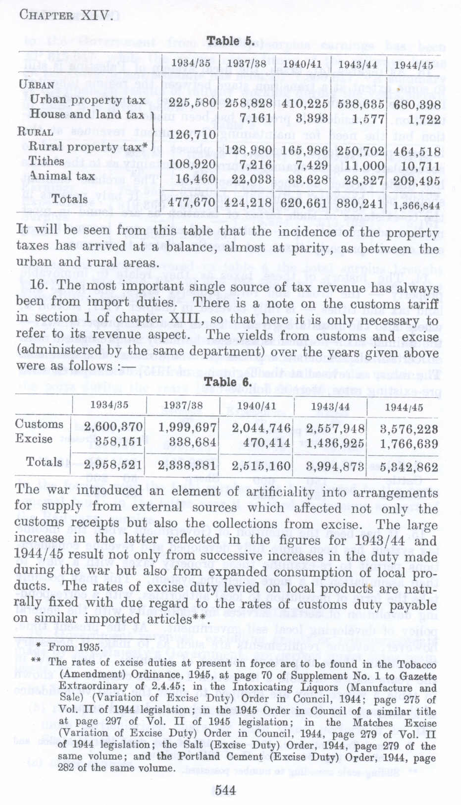 The war introduced an element of artificiality into arrangements for supply from external sources which affected not only the customs receipts but also the collections from excise. The large increase in the latter reflected in the figures for 1943 / 44 and 1944/45 result not only from successive increases in the duty made during the war but also from expanded consumption of local products. The rates of excise duty levied on local products are naturally fixed with due regard to the rates of customs duty payable on similar imported articles=".