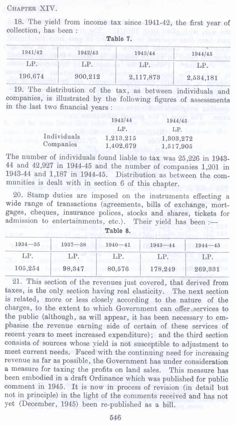 Tables showing Yield From Income Tax For Years 1941-1945, and Duties Collected on Wide Range of Transaction in Palestine before 1948 (Nakba), British Mandate: A Survey of Palestine: Volume II - Page 546. Chapter XIV: Finance: Section 2: The System of Taxation : Table 7 |