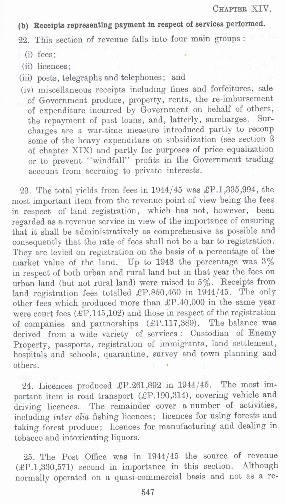 25. The Post Office was in 1944/45 the source of revenue (£P.1,330,571) second in importance in this section. Although normally operated on a quasi-commercial basis and not as a re-