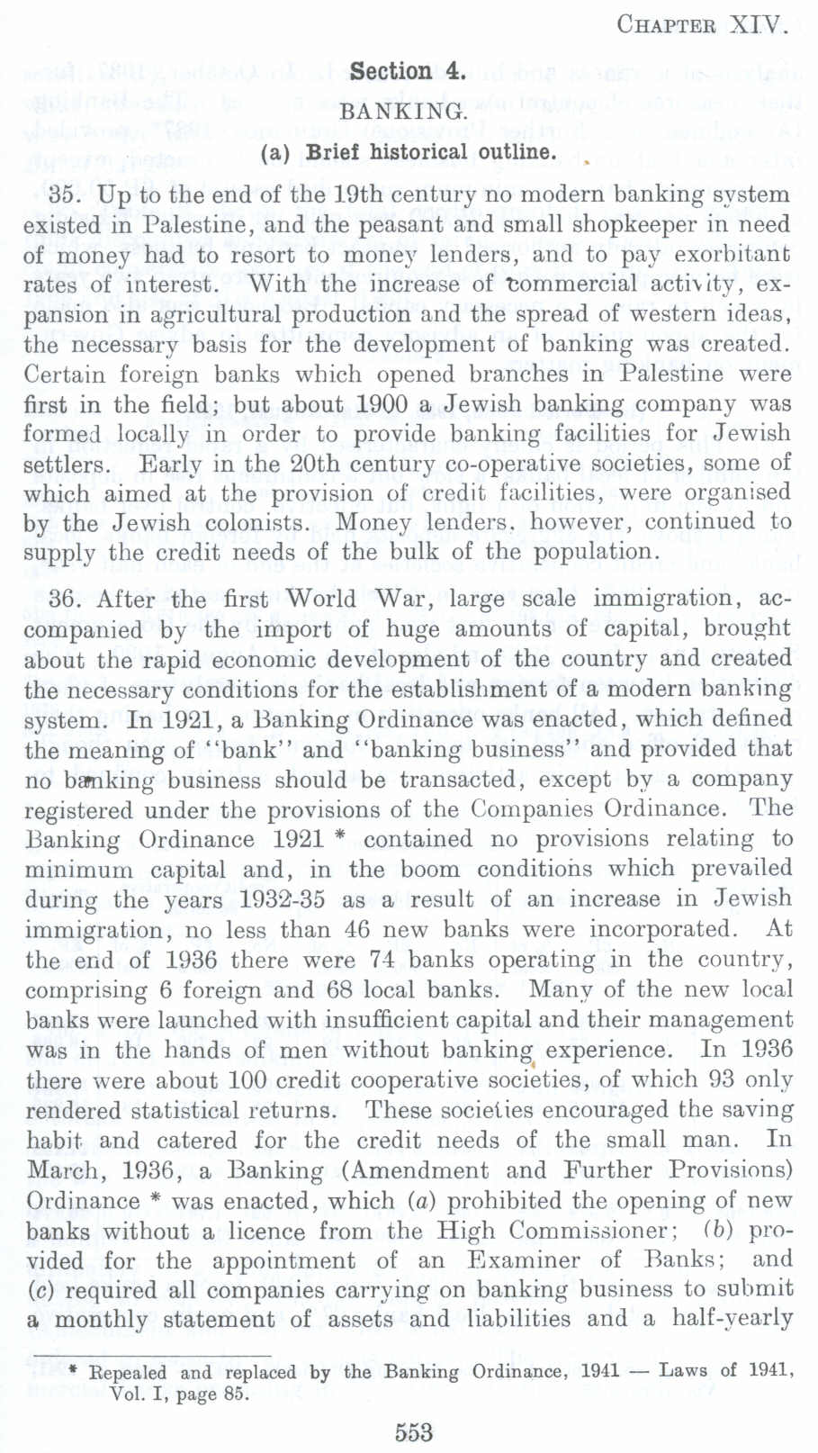 Palestinian Banking: (a) Brief history in Palestine before 1948 (Nakba), British Mandate: A Survey of Palestine: Volume II - Page 553. Chapter XIV: Finance: Section 4 |