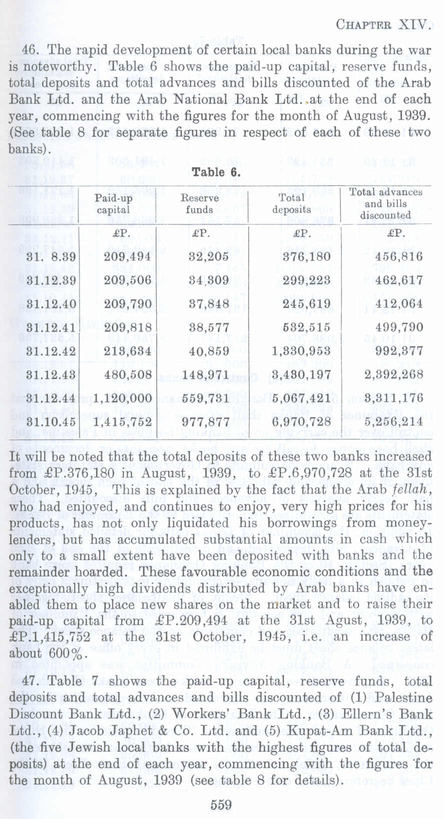 46. The rapid development of certain local banks during the war is noteworthy. Table 6 shows the paid-up capital, reserve funds, total deposits and total advances and bills discounted of the Arab Bank Ltd. and the Arab National Bank Ltd .. at the end of each year, commencing with the figures for the month of August, 1939. (See table 8 for separate figures in respect of each of these two banks).