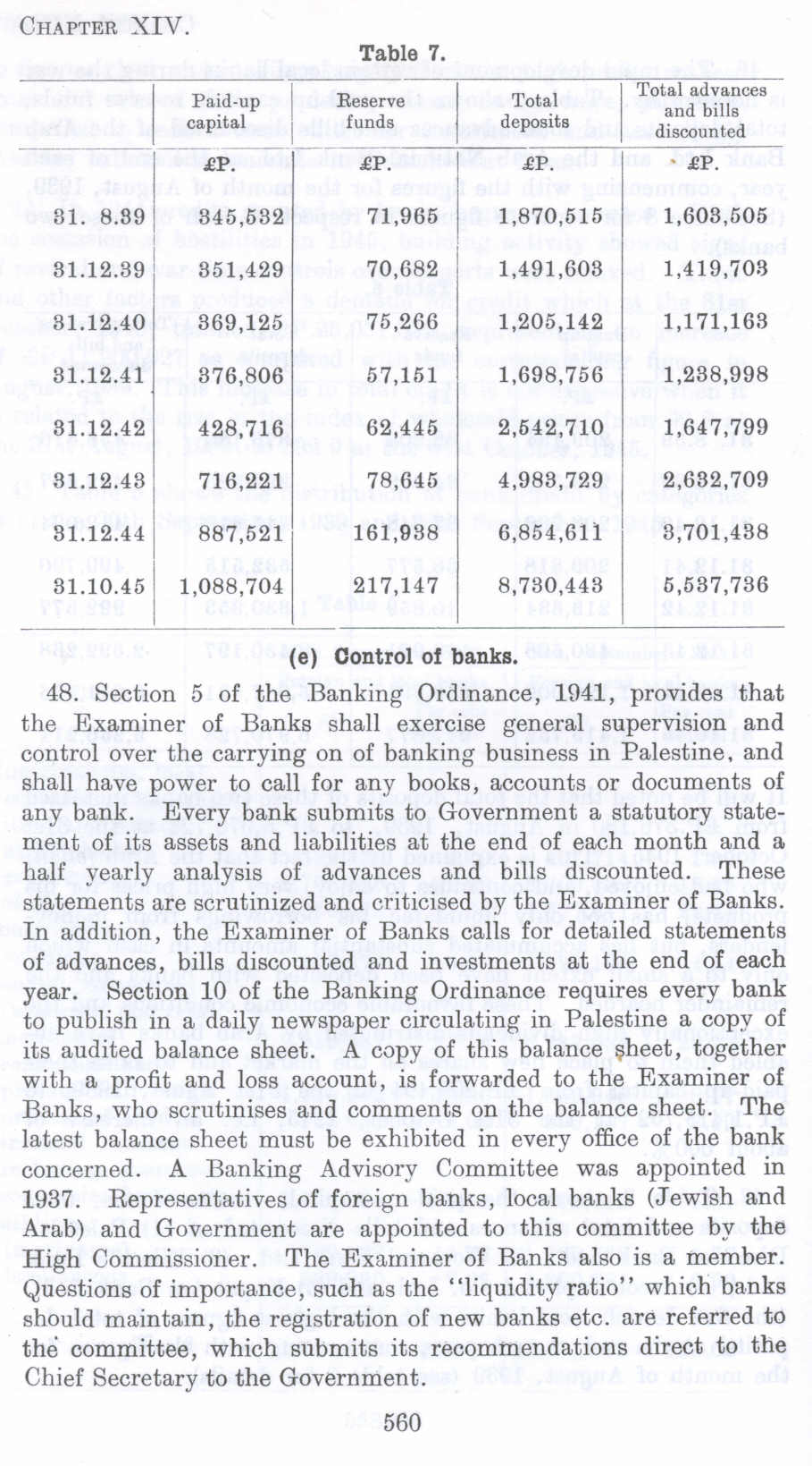 48. Section 5 of the Banking Ordinance, 1941, provides that the Examiner of Banks shall exercise general supervision and control over the carrying on of banking business in Palestine, and shall have power to call for any books, accounts or documents of any bank. Every bank submits to Government a statutory statement of its assets and liabilities at the end of each month and a. half yearly analysis of advances and bills discounted. These statements are scrutinized and criticised by the Examiner of Banks. In addition, the Examiner of Banks calls for detailed statements of advances, bills discounted and investments at the end of each year. Section 10 of the Banking Ordinance requires every bank to publish in a daily newspaper circulating in Palestine a copy of its audited balance sheet. A copy of this balance sheet, together with a profit and loss account, is forwarded to the Examiner of Banks, who scrutinises and comments on the balance sheet. The latest balance sheet must be exhibited in every office of the bank concerned. A Banking Advisory Committee was appointed in 1937. Representatives of foreign banks, local banks (Jewish and Arab) and Government are appointed to this committee by the High Commissioner. The Examiner of Banks also is a member. Questions of importance, such as the "liquidity ratio" which banks should maintain, the registration of new banks etc. are referred to the committee, which submits its recommendations direct to the Chief Secretary to the Government.