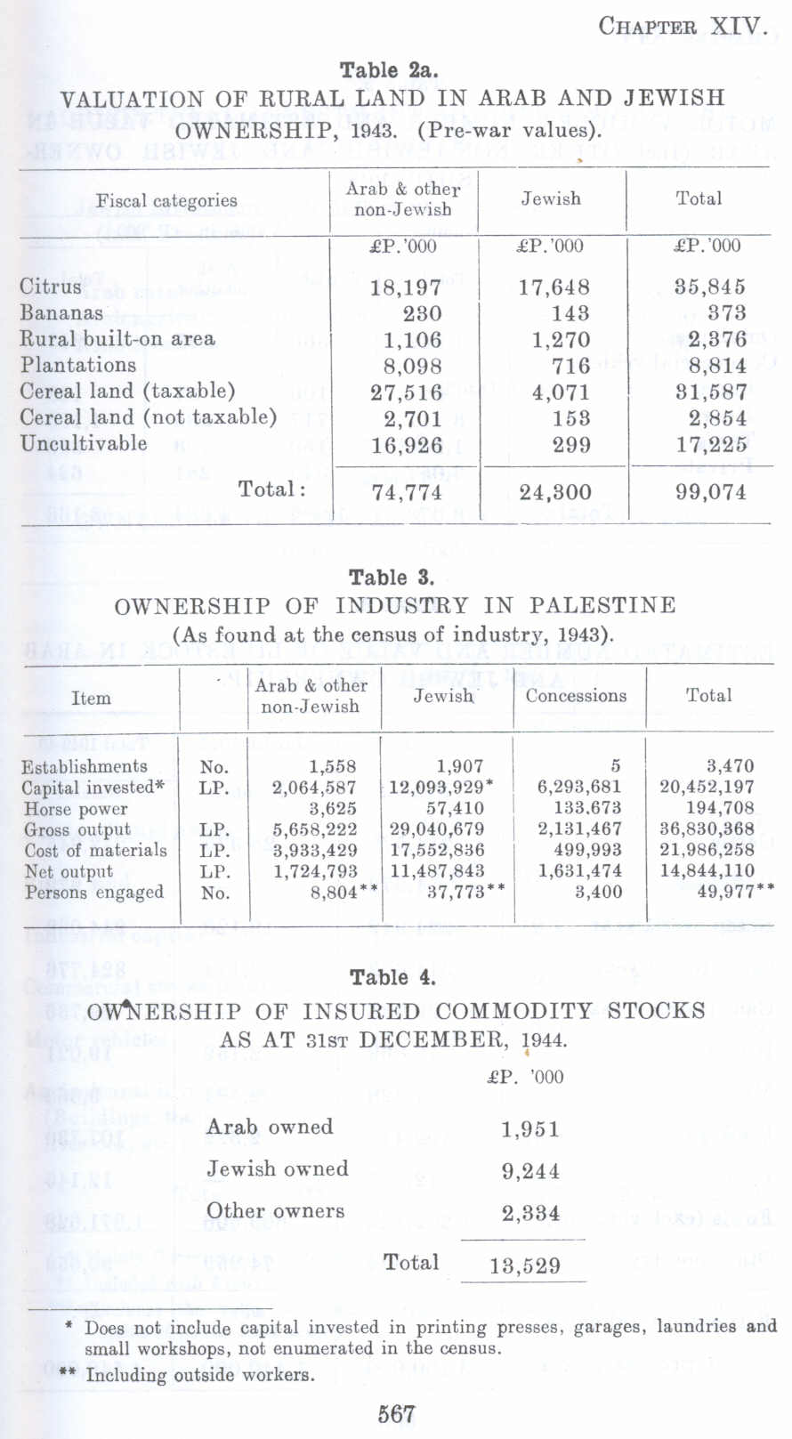 Tables showing the valuation of Rural Land in Palestinain Arab And Jewish Ownership in 1943, and Ownership of Industry in Palestine in 1943, and Ownership of Insured Commodity Stocks in 1945 before 1948 (Nakba), British Mandate: A Survey of Palestine: Volume II - Page 567. Chapter XIV: Finance: Section 5: Ownership of Capital : Table 2a