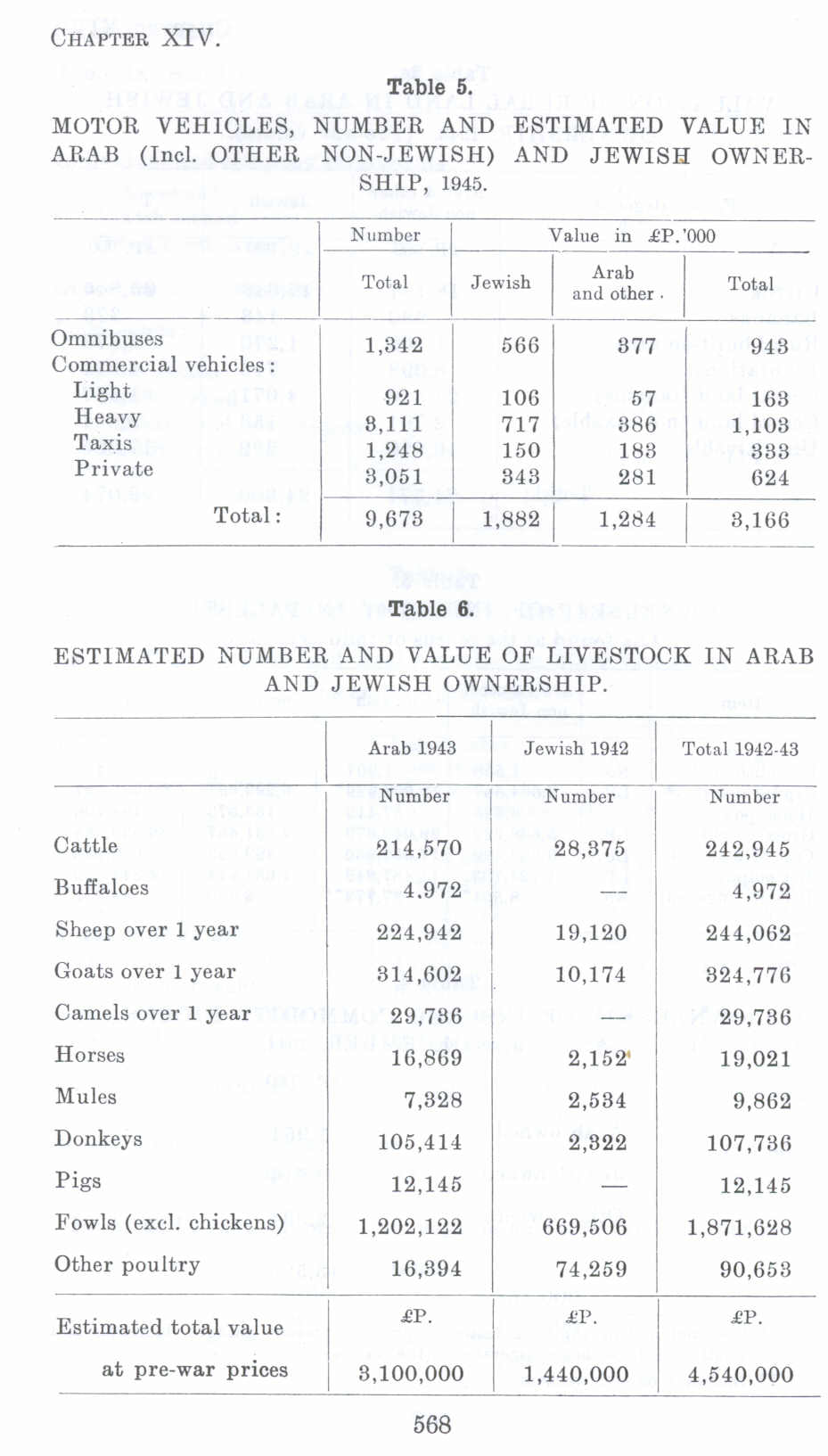 Tables showing Motor Vehicles, Number and Estimated Value in Palestinian Arab and Jewish Ownership, Table 6: Estimated Number And Value of Livestock in Palestinian Arab And Jewish Ownership in Palestine before 1948 (Nakba), British Mandate: A Survey of Palestine: Volume II - Page 568. Chapter XIV: Finance: Section 5: Ownership of Capital : Table 5: