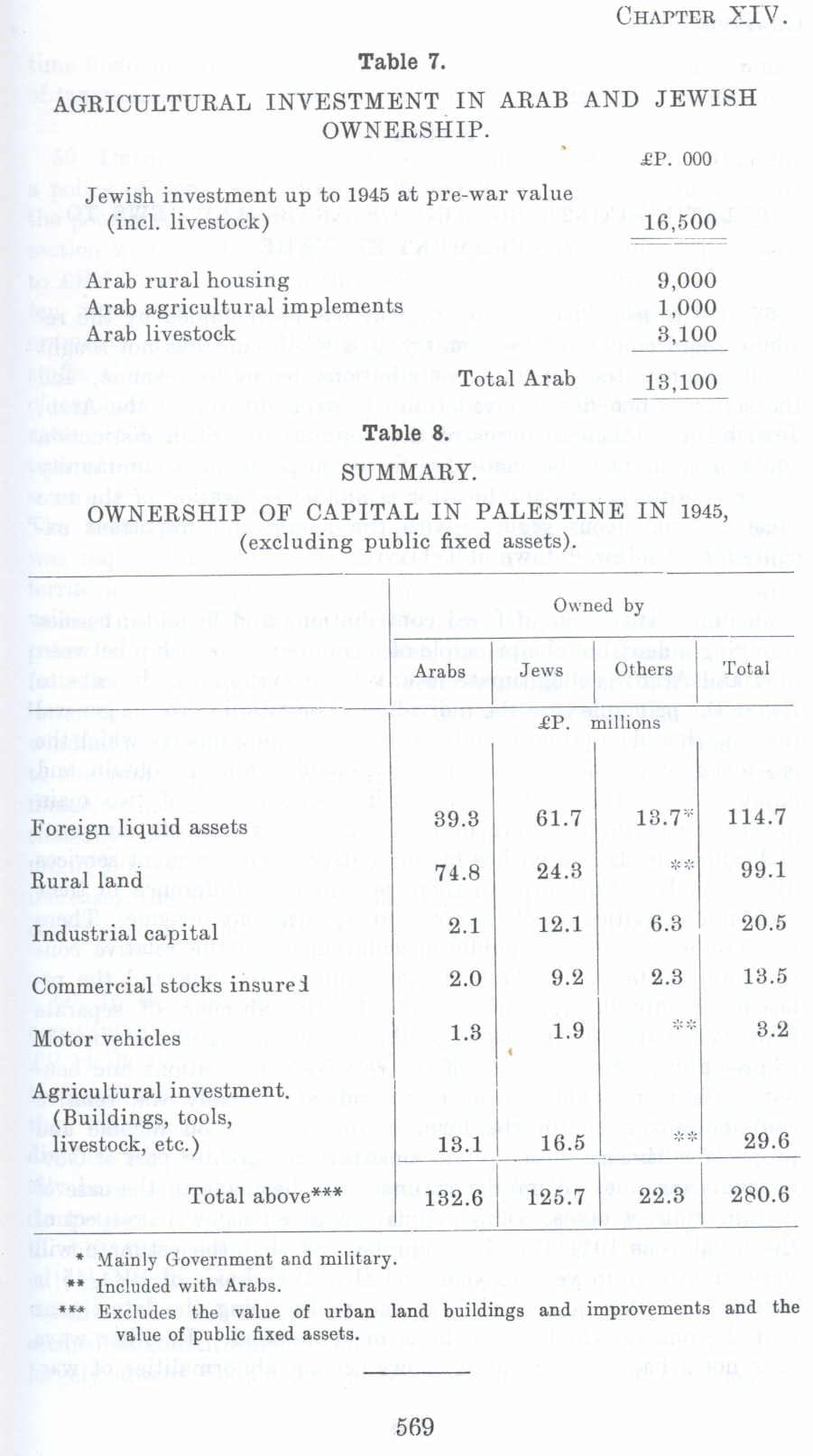 Tables showing Agricultural Investment in Palestinian Arab and Jewish Ownership,and Summary of Capital in Palestine in 1945 before 1948 (Nakba), British Mandate: A Survey of Palestine: Volume II - Page 569. Chapter XIV: Finance: Section 5: Ownership of Capital : Table 7 |