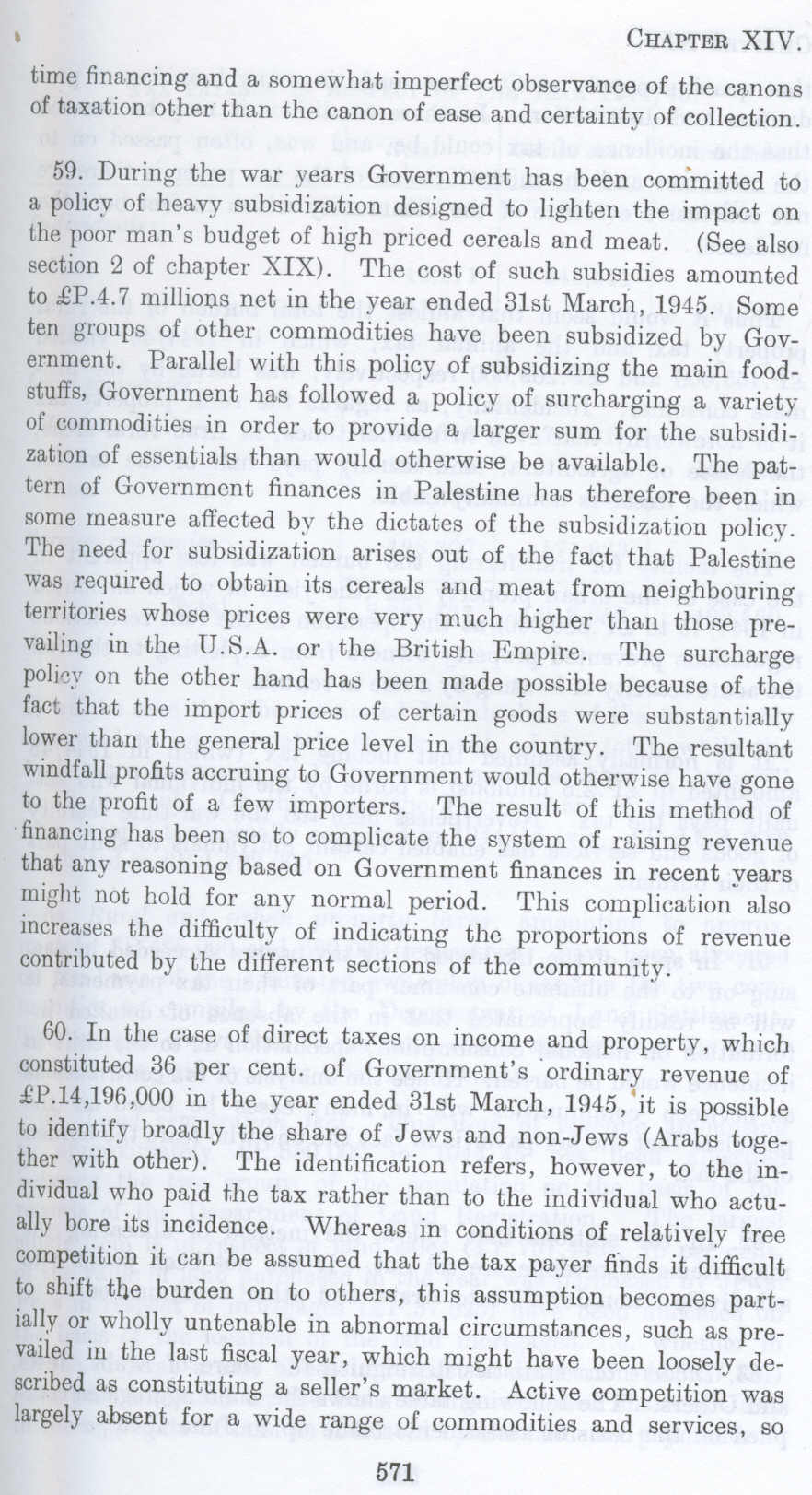 59. During the war years Government has been committed to a policy of heavy subsidization designed to lighten the impact on the poor man's budget of high priced cereals and meat. (See also section 2 of chapter XIX). The cost of such subsidies amounted to £P.4.7 millions net in the year ended 31st March, 1945. Some ten groups of other commodities have been subsidized by Government. Parallel with this policy of subsidizing the main foodstuffs, Government has followed a policy of surcharging a variety of commodities in order to provide a larger sum for the subsidization of essentials than would otherwise be available. The pattern of Government finances in Palestine has therefore been in some measure affected bv the dictates of the subsidization policy. The need for subsidization arises out of the fact that Palestine was required to obtain its cereals and meat from neighbouring territories whose prices were very much higher than those prevailing in the U.S.A. or the British Empire. The surcharge poliey on the other hand has been made possible because of the fact that the import prices of certain goods were substantially lower than the general price level in the country. The resultant windfall profits accruing to Government would otherwise have gone to the profit of a few importers. The result of this method of financing has been so to complicate the system of raising revenue that any reasoning based on Government finances in recent years might not bold for any normal period. This complication also increases the difficulty of indicating the proportions of revenue contributed by the different sections of the community.