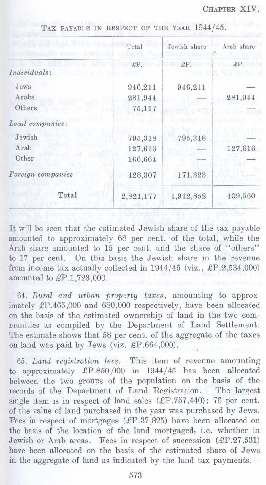 64. Rural and Urban property taxes, amounting to approximately £P.465 ,000 and 680,000 respectively, have been allocated on the basis of the estimated ownership of land in the two communities as compiled by the Department of Laud Settlement. The estimate shows that 58 per cent. of the aggregate of the taxes on land was paid by Jews (viz. £P.664,000).