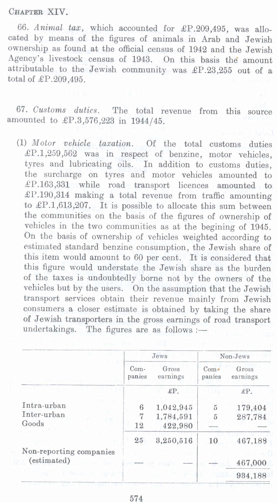 (1) AI otor vehicle taxation. Of the total customs duties £P.l,259,562 was in respect of benzine, motor vehicles, tyres and lubricating oils. In addition to customs duties, the surcharge on tyres and motor vehicles amounted to £P.163,331 while road transport licences amounted to £P.190,314 making a total revenue from traffic amounting to £P.l,613,207. It is possible to allocate this sum between the communities on the basis of the figures of ownership of vehicles in the two communities as at the beginning of 1945. On the basis of ownership of vehicles weighted according to estimated standard benzine consumption, the Jewish share of this item would amount to 60 per cent. It is considered that this figure would understate the Jewish share as the burden of the taxes is undoubtedly borne not by the owners of the vehicles but by the users. On the assumption that the Jewish transport services obtain their revenue mainly from Jewish consumers a closer estimate is obtained by taking the share of Jewish transporters in the gross earnings of road transport undertakings. The figures are as follows :-