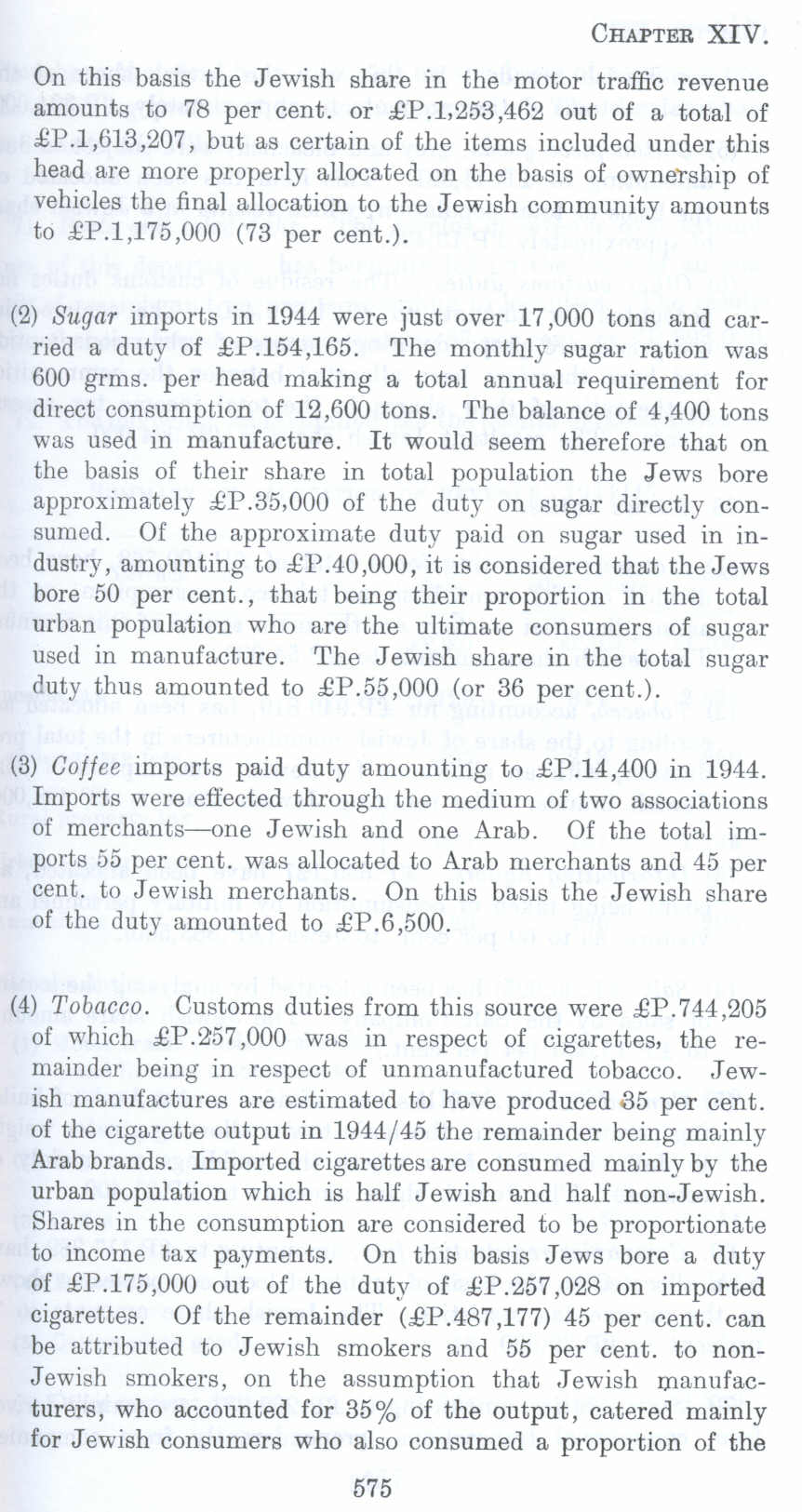 (2) Sugar imports in 1944 were just over 17,000 tons and carried a duty of £P.154,165. The monthly sugar ration was 600 grms. per head making a total annual requirement for direct consumption of 12,600 tons. The balance of 4,400 tons was used in manufacture. It would seem therefore that on the basis of their share in total population the Jews bore approximately £P.35,000 of the duty on sugar directly consumed. Of the approximate duty paid on sugar used in industry, amounting to £P.40,000, it is considered that the Jews bore 50 per cent., that being their proportion in the total urban population who are the ultimate consumers of sugar used in manufacture. The Jewish share in the total sugar duty thus amounted to £P.55,000 (or 36 per cent.).