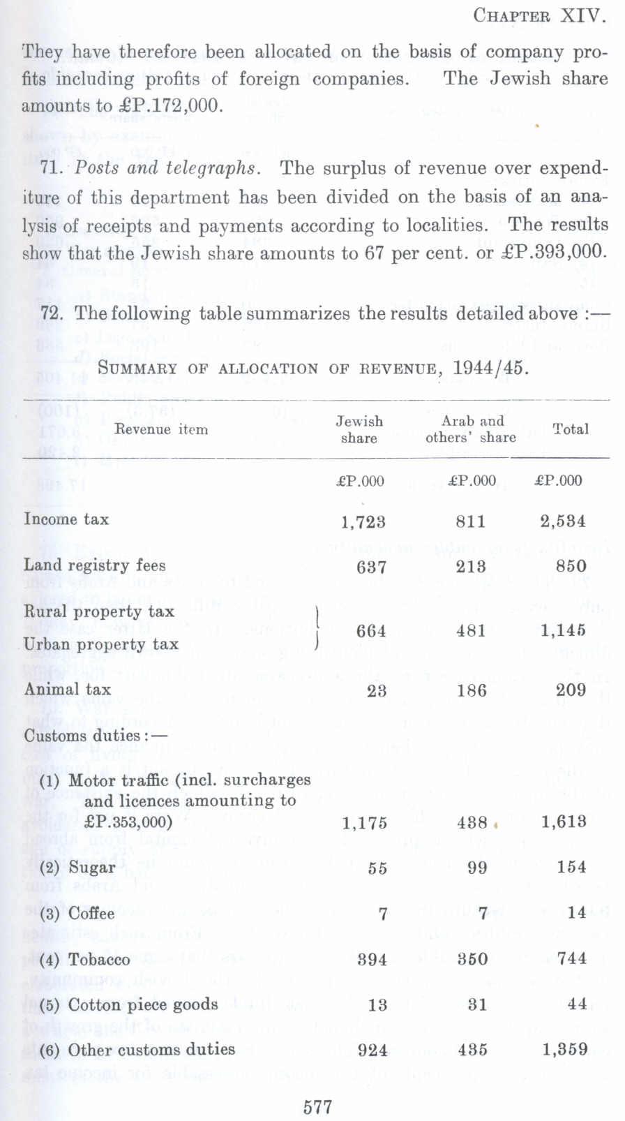 Summary of Allocation of Revenue, 1944/45 in Palestine before 1948 (Nakba), British Mandate: A Survey of Palestine: Volume II - Page 577. Chapter XIV: Finance: Section 6: Relative Contribution of Arabs and Jewish Government Revenue : |