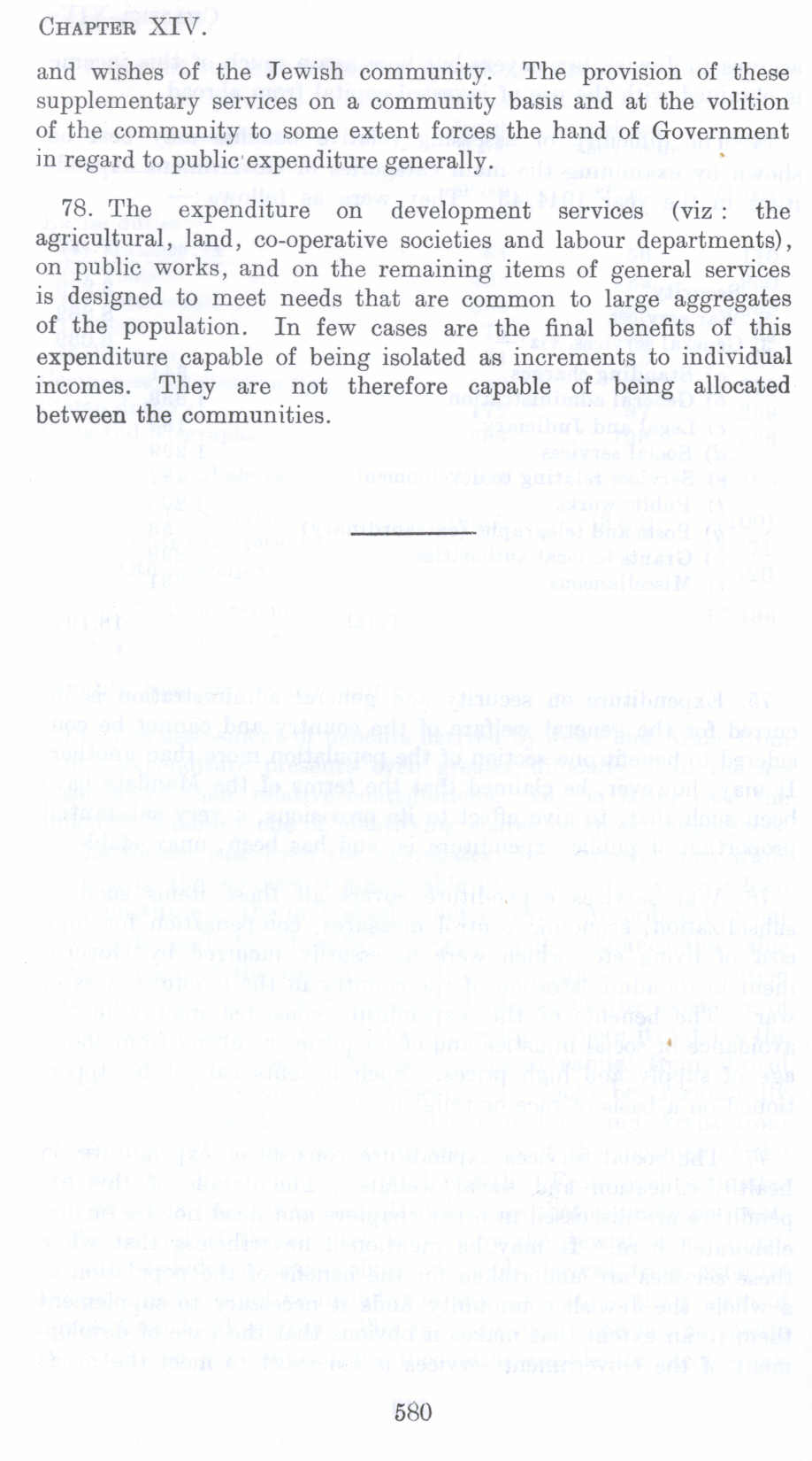 78. The expenditure on development services (viz : the agricultural, land, co-operative societies and labour departments), on public works, and on the remaining items of general services is designed to meet needs that are common to large aggregates of the population. In few cases are the final benefits of this expenditure capable of being isolated as increments to individual incomes. They are not therefore capable of being allocated between the communities.