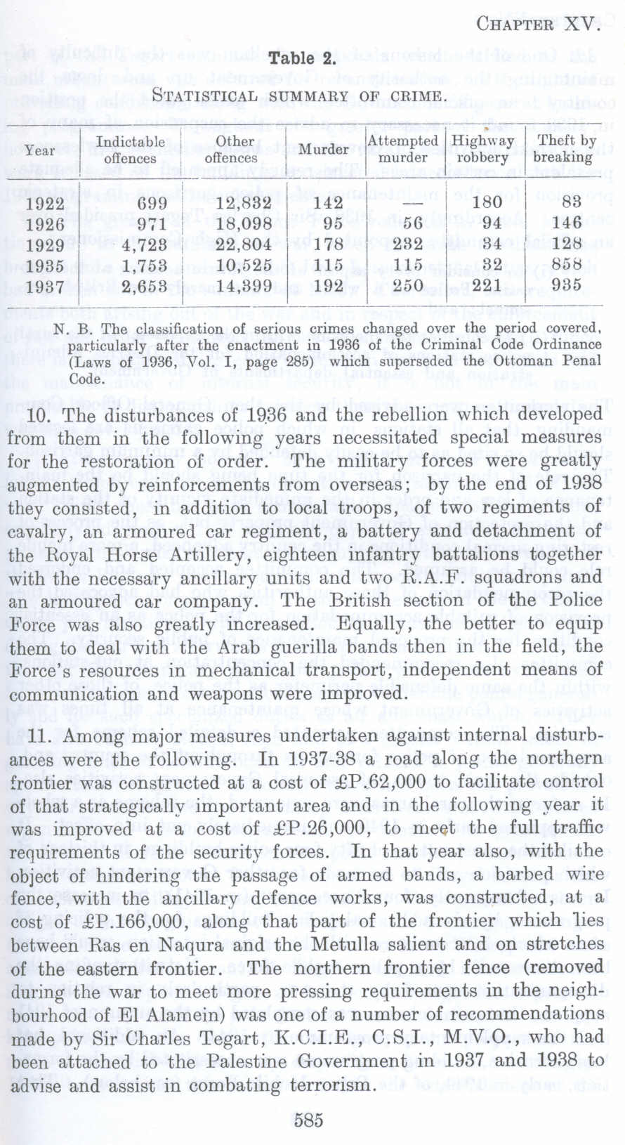 11. Among major measures undertaken against internal disturbances were the following. In 1937-38 a road along the northern frontier was constructed at a cost of £P .62,000 to facilitate control of that strategically important area and in the following year it was improved at a cost of £P.26,000, to meet the full traffic requirements of the security forces. In that year also, with the object of hindering the passage of armed bands, a barbed wire fence, with the ancillary defence works, was constructed, at a cost of £P.166,000, along that part of the frontier which lies between Ras en Naqura and the Metulla salient and on stretches of the eastern frontier. The northern frontier fence (removed during the war to meet more pressing requirements in the neighbourhood of El Alamein) was one of a number of recommendations made by Sir Charles Tegart, K.C.I.E., C.S.I., M.V.O., who had been attached to the Palestine Government in 1937 and 1988 to advise and assist in combating terrorism.