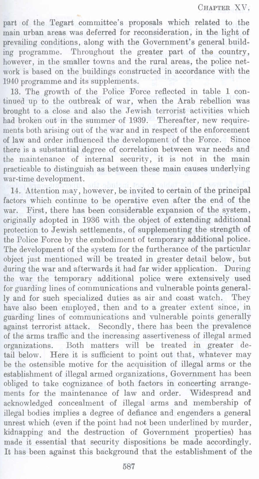 13. The growth of the Police Force reflected in table 1 continued up to the outbreak of war, when the Arab rebellion was brought to a close and also the .T ewish terrorist activities which bad broken out in the summer of 1939. Thereafter, new requirements both arising out of the war and in respect of the enforcement of law and order influenced the development of the Force. Since there is a substantial degree of correlation between war needs and the maintenance of internal security, it is not in the main practicable to distinguish as between these main causes underlying war-time development.