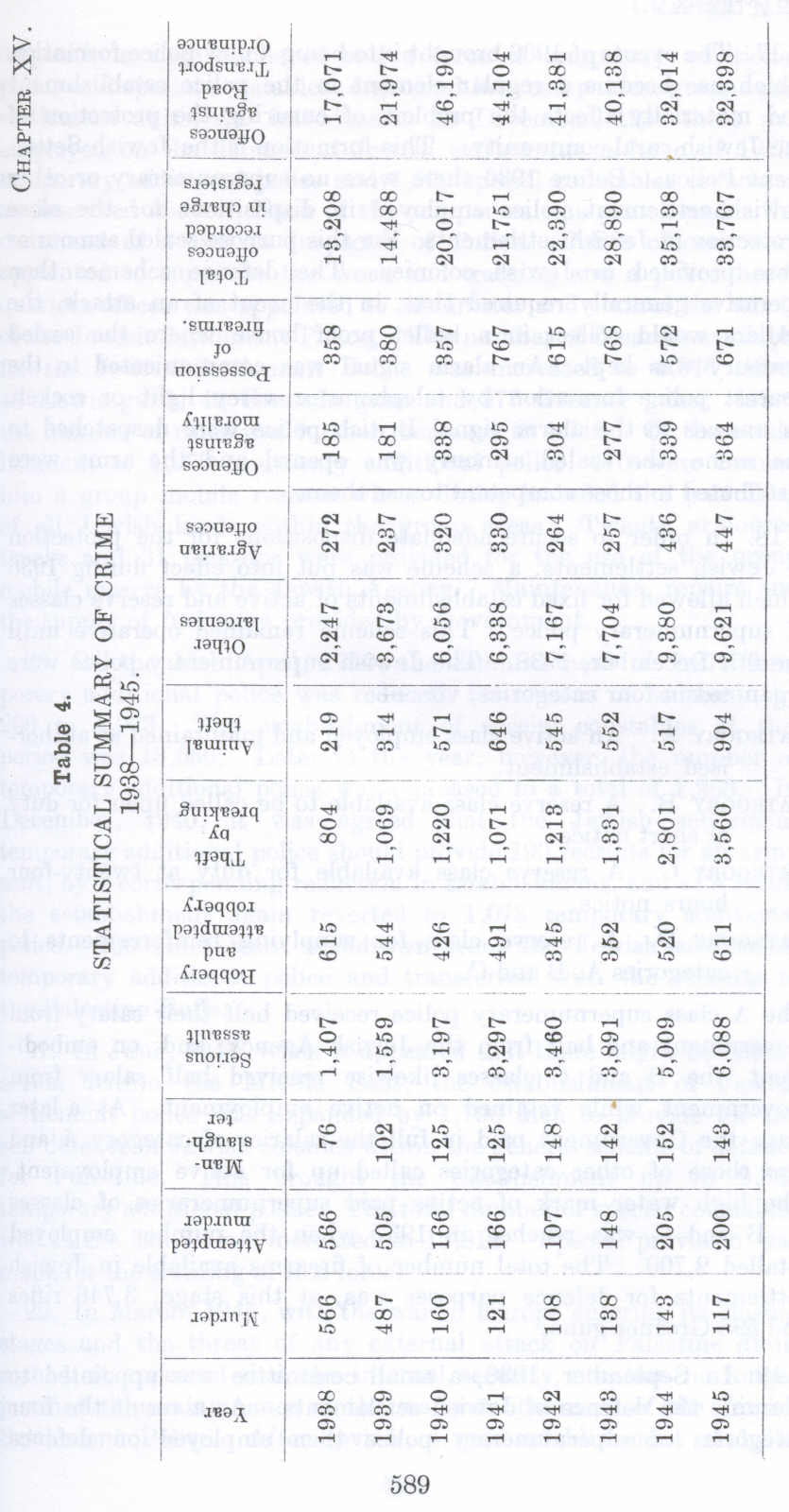 British Mandate: A Survey of Palestine: Volume II - Page 589. Chapter XV: Law and Order : (a) Prevention and Detection of Crime : Table 4: Statistical Summary of Crime, 1938 - 1945 |
