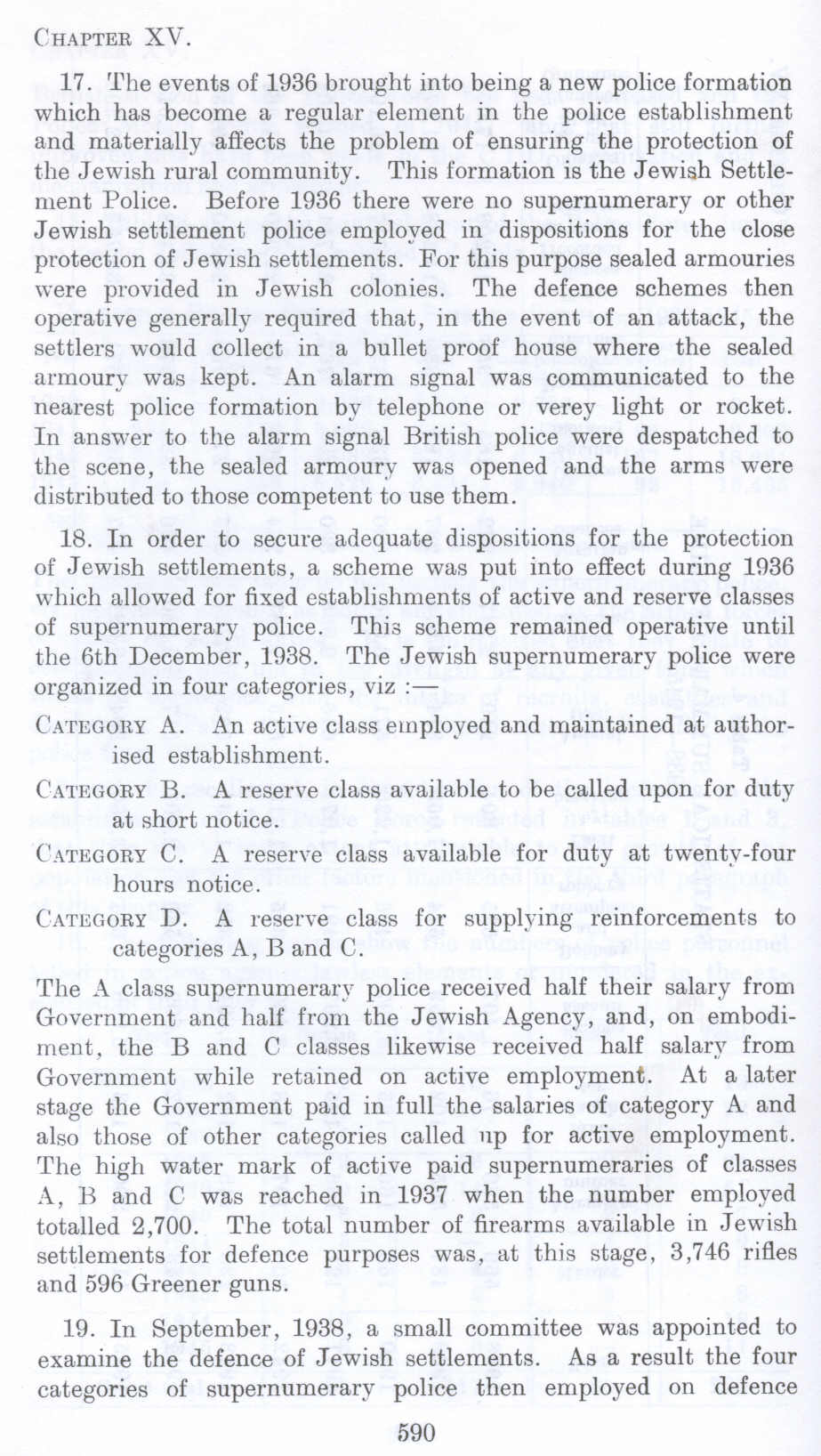 18. In order to secure adequate dispositions for the protection of Jewish settlements, a scheme was put into effect during 1036 which allowed for fixed establishments of active and reserve classes of supernumerary police. Thia scheme remained operative until the 6th December, 1938. The Jewish supernumerary police were organized in four categories, viz :-