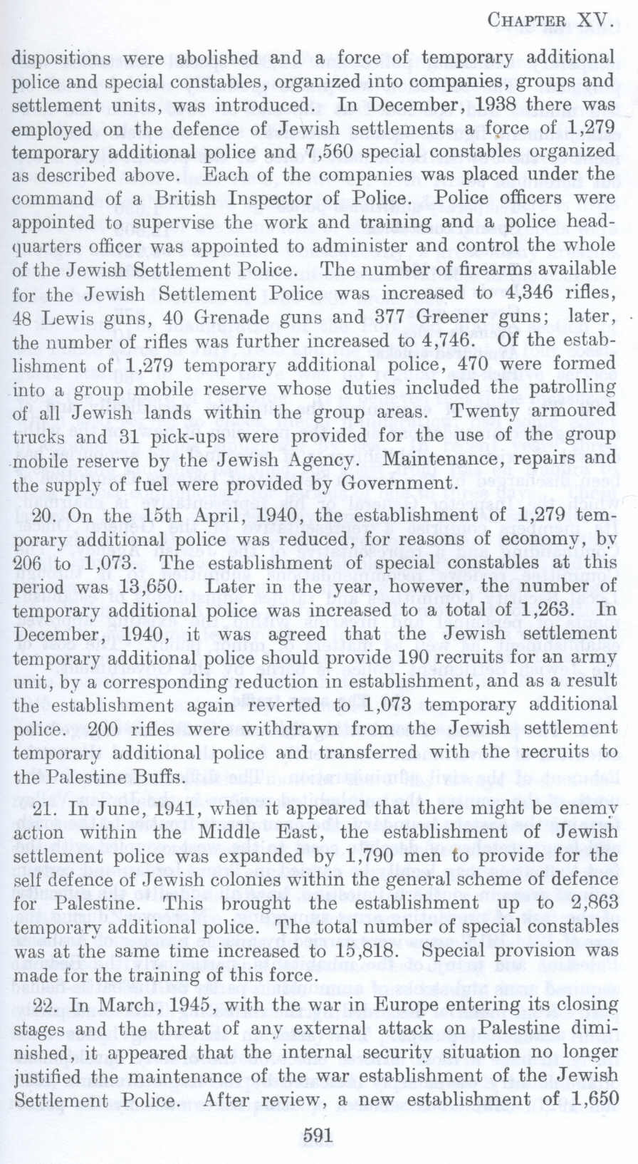 22. In March, 1945, with the war in Europe entering its closing stages and the threat of any external attack on Palestine diminished, it appeared that the internal security situation no longer justified the maintenance of the war establishment of the Jewish Settlement Police. After review, a new establishment of 1,650