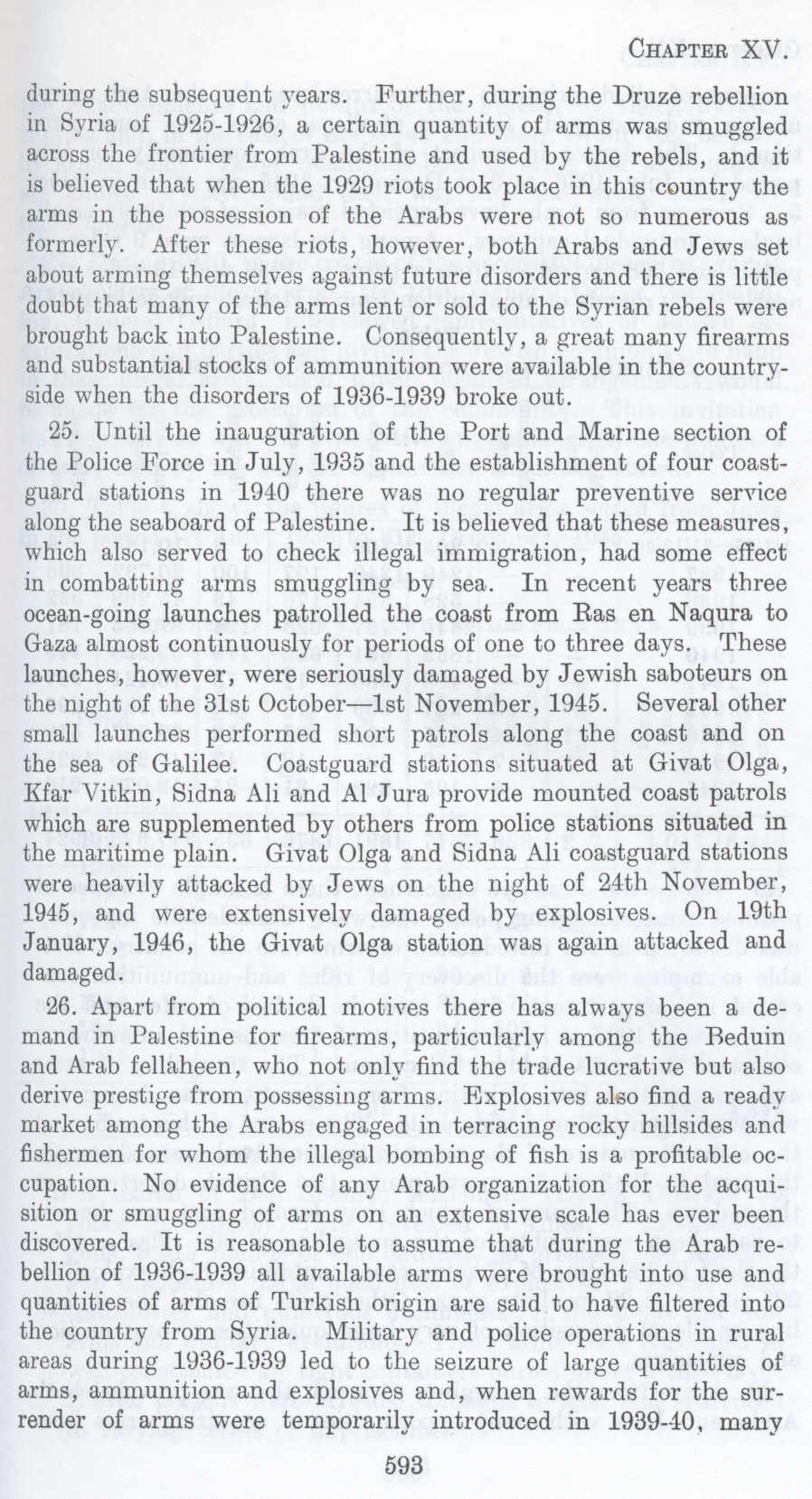 during the subsequent years. Further, during the Druze rebellion in Syria of 1925-1926, a certain quantity of arms was smuggled across the frontier from Palestine and used by the rebels, and it is believed that when the 1929 riots took place in this country the arms in the possession of the Arabs were not so numerous as formerly. After these riots, however, both Arabs and Jews set about arming themselves against future disorders and there is little doubt that many of the arms lent or sold to the Syrian rebels were brought back into Palestine. Consequently, a great many firearms and substantial stocks of ammunition were available in the countryside when the disorders of 1936-1939 broke out.