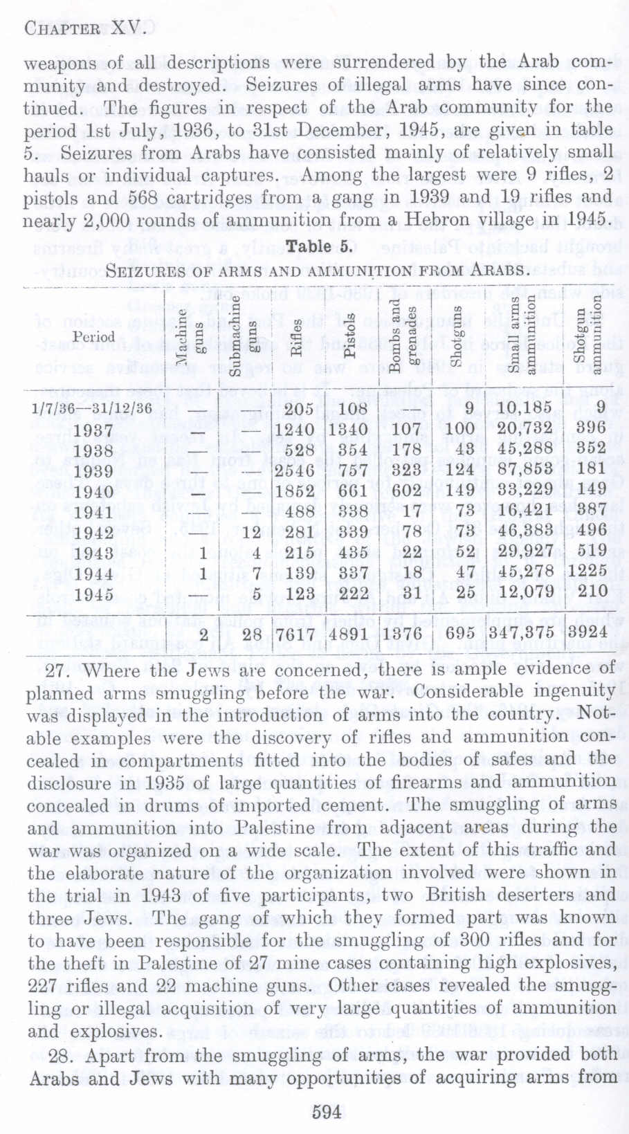 Table showing seizure of Arms And Ammunition From Arabs, 1936 - 1945 in Palestine before 1948 (Nakba), British Mandate: A Survey of Palestine: Volume II - Page 594. Chapter XV: Law and Order : (b) Arms Traffic : Table 5 |