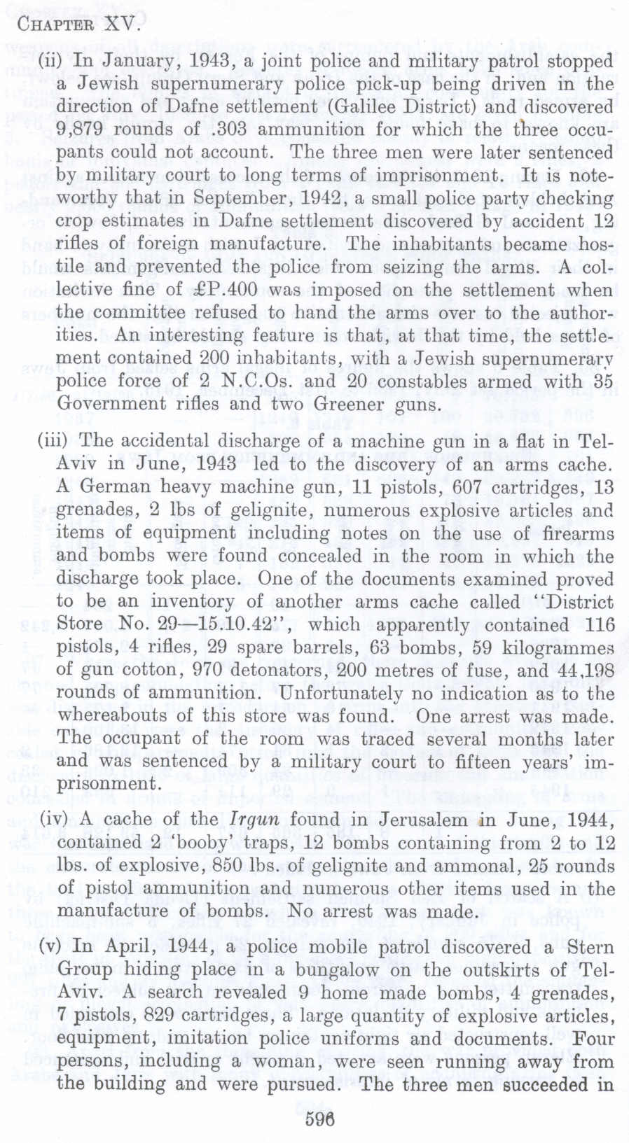 (iii) The accidental discharge of a machine gun in a flat in Tel Aviv in June, 1943 led to the discovery of an arms cache. A German heavy machine gun, 11 pistols, 607 cartridges, 13 grenades, 2 lbs of gelignite, numerous explosive articles and items of equipment including notes on the use of firearms and bombs were found concealed in the room in which the discharge took place. One of the documents examined proved to be an inventory of another arms cache called "District Store No. 2!J-15.10.42", which apparently contained 116 pistols, 4 rifles, 29 spare barrels, 63 bombs, 59 kilogrammes of gun cotton, 970 detonators, 200 metres of fuse, and 44,198 rounds of ammunition. Unfortunately no indication as to the whereabouts of this store was found. One arrest was made. The occupant of the room was traced several months later and was sentenced by a military court to fifteen years' imprisonment.