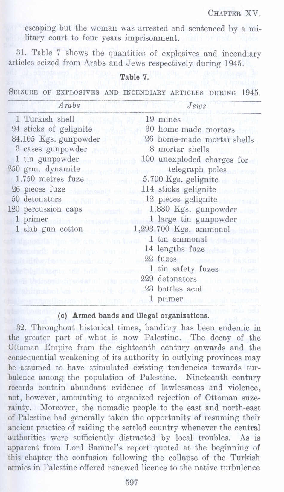 31. Table 7 shows the quantities of explosives and incendiary articles seized from Arabs and Jews respectively during 1945.