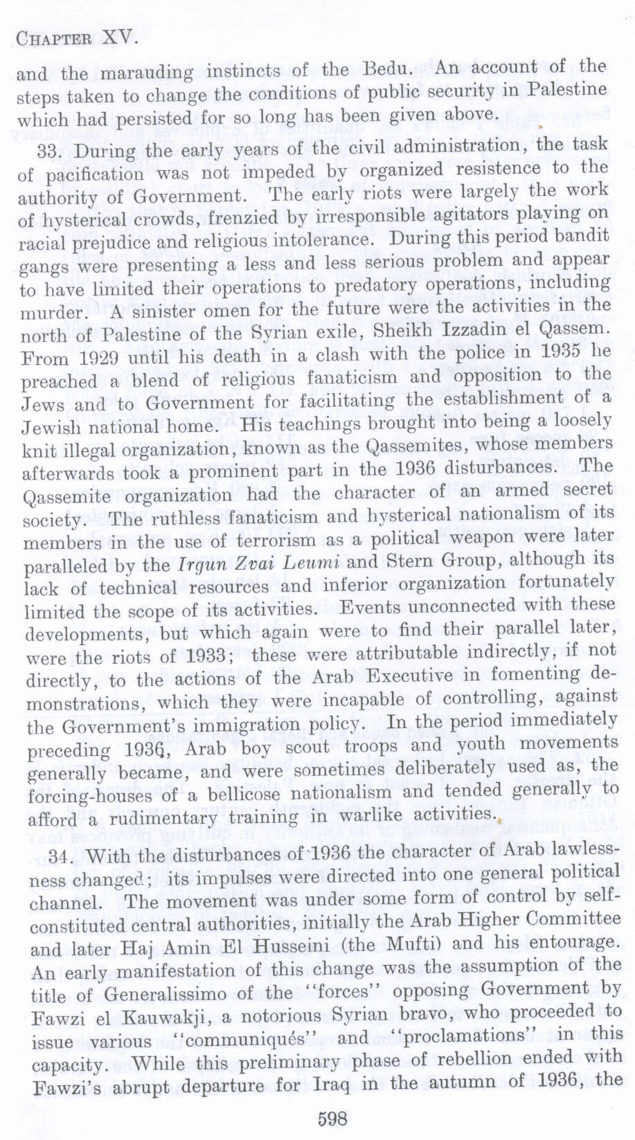 33. During the early years of the civil administration, the task of pacification was not impeded by organized resistence to the authority of Government. The early riots were largely the work of hysterical crowds, frenzied by irresponsible agitators playing on racial prejudice and religious intolerance. During this period bandit gangs were presenting a less and less serious problem and appear to have limited their operations to predatory operations, including murder. A sinister omen for the future were the activities in the north of Palestine of the Syrian exile, Sheikh Izzadin el Qassem. From 1Q29 until his death in a clash with the police in 1Q35 he preached a blend of religious fanaticism and opposition to the Jews and to Government for facilitating the establishment of a Jewish national home. His teachings brought into being a loosely knit illegal organization, known as the Qassemites, whose members afterwards took a prominent part in the 1936 disturbances. The Qassemite organization bad the character of an armed secret society. The ruthless fanaticism and hysterical nationalism of its members in the use of terrorism as a political weapon were later paralleled by the Irqun Zvai Leumi and Stern Group, although its lack of technical resources and inferior organization fortunately limited the scope of its activities. Events unconnected with these developments, but which again were to find their parallel later, were the riots of 1933; these were attributable indirectly, if not directly, to the actions of the Arab Executive in fomenting demonstrations, which they were incapable of controlling, against the Government's immigration policy. In the period immediately preceding 193G, Arab boy scout troops and youth movements generally became, and were sometimes deliberately used as, the forcing-houses of a bellicose nationalism and tended general!)' to afford a rudimentary training in warlike activities.