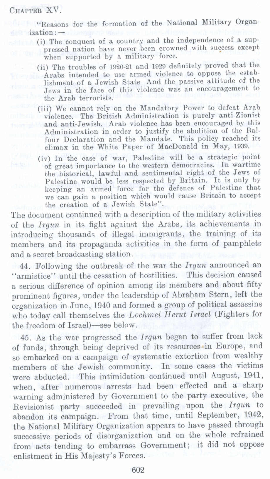 45. As the war progressed the Irgun began to suffer from lack of funds, through being deprived of its resources in Europe, and so embarked on a campaign of systematic extortion from wealthy members of the Jewish community. In some cases the victims were abducted. This intimidation continued until August, 1941, when, after numerous arrests had been effected and a sharp warning administered by Government to the party executive, the Revisionist party succeeded in prevailing upon the Irgun to abandon its campaign. From that time, until September, 1942, the National Military Organization appears to have passed through successive periods of disorganization and on the whole refrained from ads tending to embarrass Government; it did not oppose enlistment in His Majesty's Forces.
