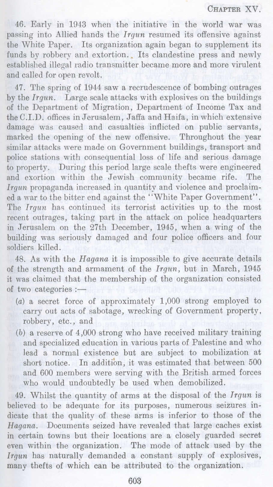 46. Early in 1943 when the initiative in the world war was passing into Allied hands the Irgun resumed its offensive against the White Paper. Its organization again began to supplement its funds by robbery and extortion .. Its clandestine press and newly established illegal radio transmitter became more and more virulent and called for open revolt.
