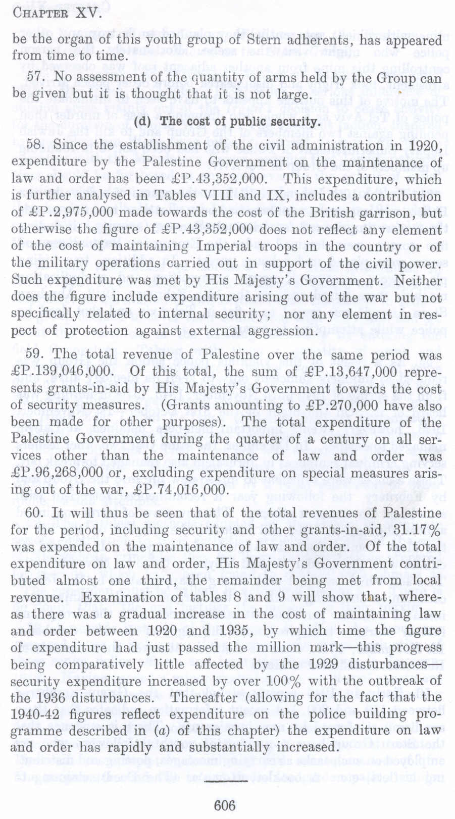 The Cost of Public Security in Palestine before 1948 (Nakba), British Mandate: A Survey of Palestine: Volume II - Page 606. Chapter XV: Law and Order : (d) |