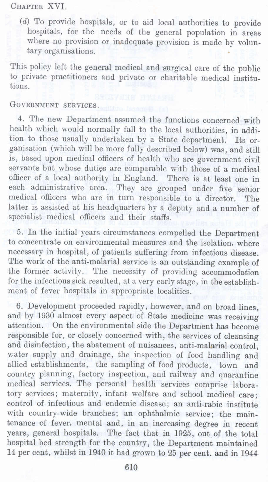 6. Development proceeded rapidly, however, and on broad lines, and by rn30 almost every aspect of State medicine was receiving attention. On the environmental side the Department has become responsible for, or closely concerned with, the services of cleansing and disinfection, the abatement of nuisances, anti-malarial control, water supply and drainage, the inspection of food handling and allied establishments, the sampling of food products, town and country planning, factory inspection, and railway and quarantine medical services. The personal health services comprise laboratory services; maternity, infant welfare and school medical care; control of infectious and endemic disease; an anti-rabic institute with country-wide branches; an ophthalmic service; The maintenance of fever, mental and, in an increasing degree in recent years, general hospitals. The fact that in 1925, out of the total hospital bed strength for the country, the Department maintained 14 per cent, whilst in 1940 it had grown to 25 per cent. and in 1944