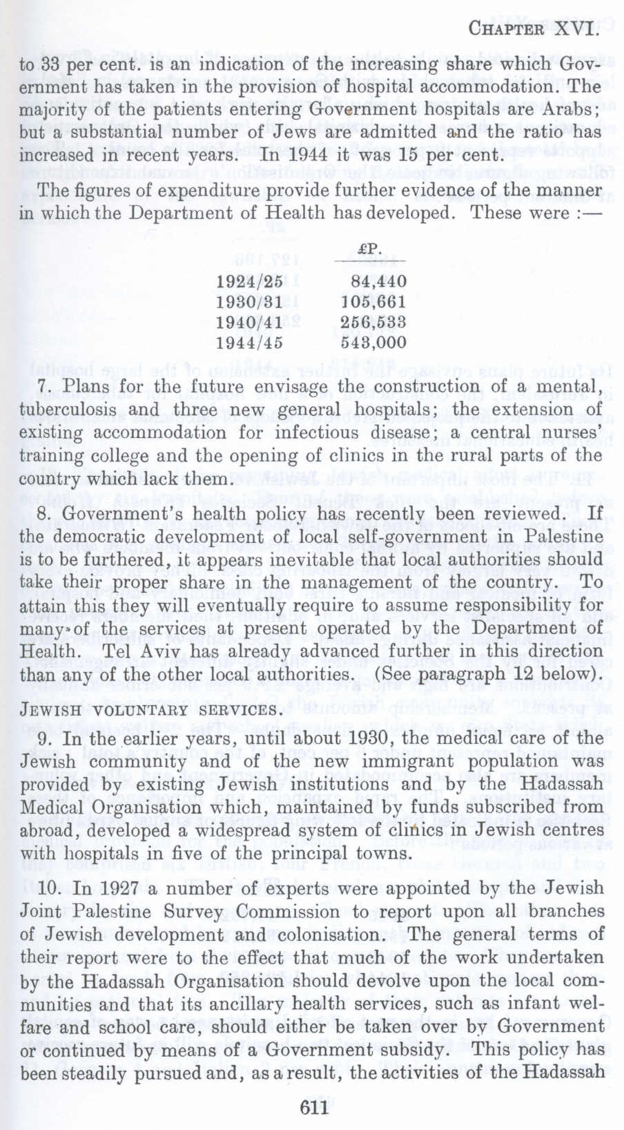 10. In 1927 a number of experts were appointed by the Jewish Joint Palestine Survey Commission to report upon all branches of Jewish development and colonisation. The general terms of their report were to the effect that much of the work undertaken by the Hadassah Organisation should devolve upon the local communities and that its ancillary health services, such as infant welfare and school care, should either be taken over by Government or continued by means of a Government subsidy. This policy has been steadily pursued and, as a result, the activities of the Hadassah