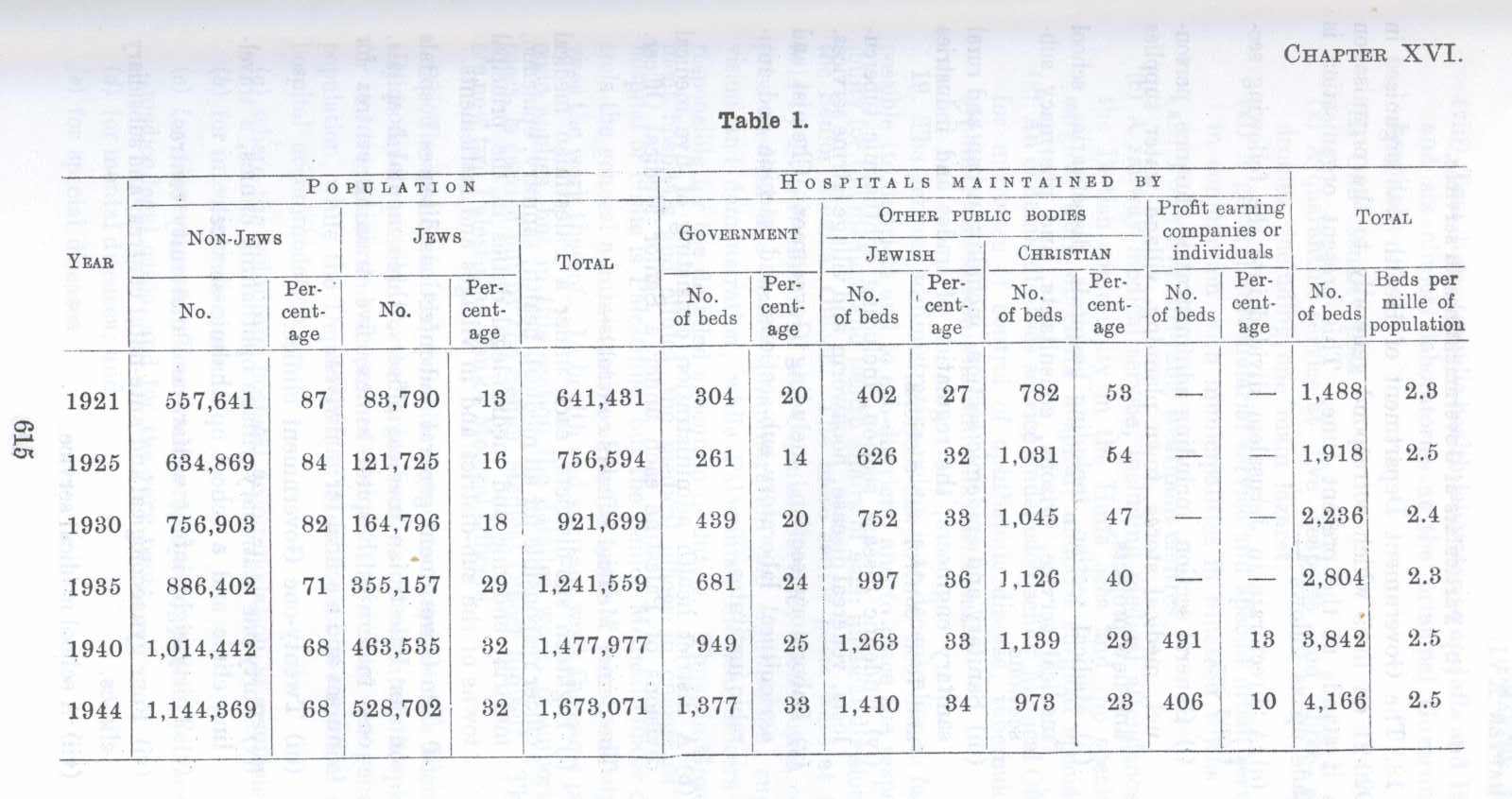 Table showing Hospitals Maintained By Religion in Palestine before 1948 (Nakba), British Mandate: A Survey of Palestine: Volume II - Page 615, . Chapter XVI: Social Services : Section 1: Health Services : (a) General Outline : Table 1 |
