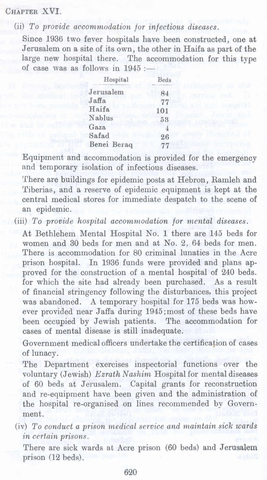 At Bethlehem Mental Hospital No. 1 there are 145 beds for women and 30 beds for men and at No. 2, 64 beds for men. There is accommodation for 80 criminal lunatics in the Acre prison hospital. In 1936 funds were provided and plans approved for the construction of a mental hospital of 240 beds. for which the site had already been purchased. As a result of financial stringency following the disturbances, this project was abandoned. A temporary hospital for 175 beds was however provided near Jaffa during 1945; most of these beds have been occupied by Jewish patients. The accommodation for cases of mental disease is still inadequate.