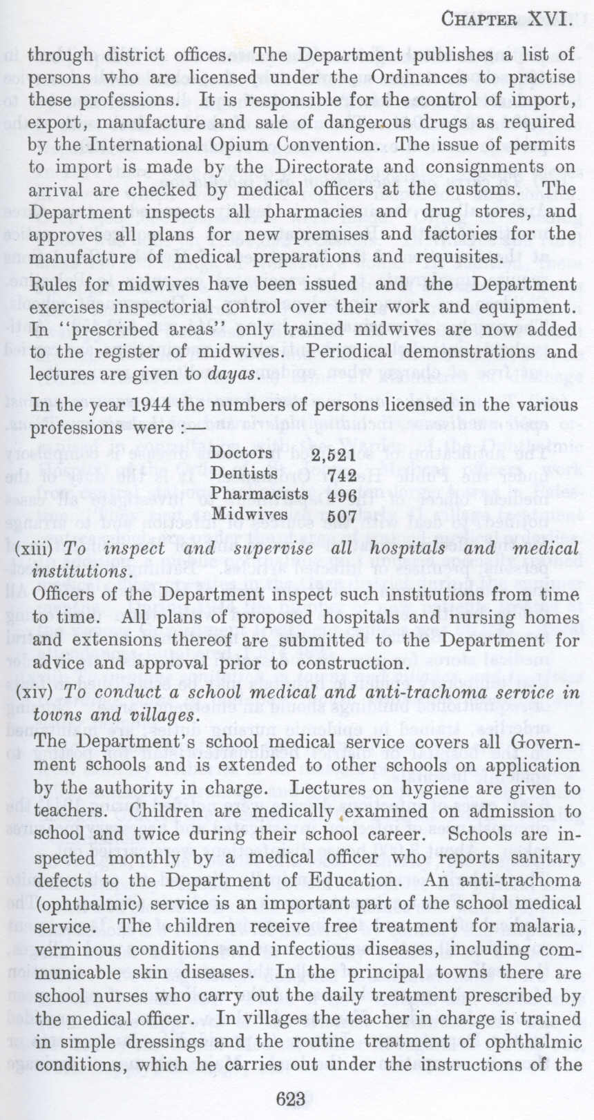 through district offices. The Department publishes a list of persons who are licensed under the Ordinances to practise these professions. It is responsible for the control of import, export, manufacture and sale of dangerous drugs as required by the International Opium Convention. The issue of permits to import is made by the Directorate and consignments on arrival are checked by medical officers at the customs. The Department inspects all pharmacies and drug stores, and approves all plans for new premises and factories for the manufacture of medical preparations and requisites.