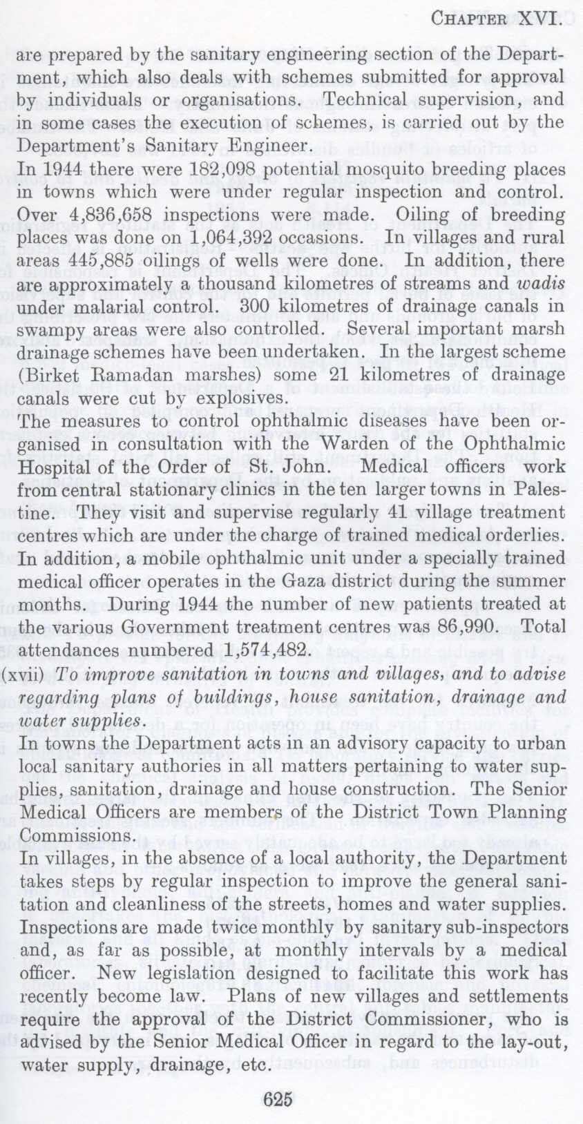 In 1944 there were 182,098 potential mosquito breeding places in towns which were under regular inspection and control. Over 4,836,058 inspections were made. Oiling of breeding places was done on 1,064,392 occasions. In villages and rural areas 445 ,885 oilings of wells were done. In addition, there are approximately a thousand kilometres of streams and wadis under malarial control. 300 kilometres of drainage canals in swampy areas were also controlled. Several important marsh drainage schemes have been undertaken. In the largest scheme (Birket Ramadan marshes) some 21 kilometres of drainage canals were cut by explosives.