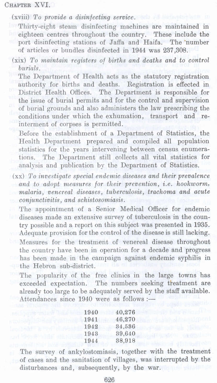 Tho appointment of a Senior Medical Officer for endemic diseases made an extensive survey of tuberculosis in the country possible and a report on this subject was presented in 1935. Adequate provision for the control of the disease is still lacking. Measures for the treatment of venereal disease throughout the country have been in operation for a decade and progress has been made in the campaign against endemic syphilis in the Hebron sub-district.