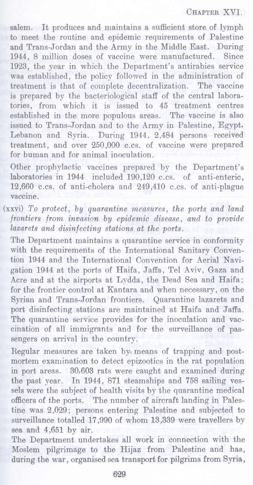 Regular measures are taken by. means of trapping and postmortem examination to detect epizootics in the rat population in port areas. 30,603 rats were caught and examined during the past year. In 1944, 871 steamships and 758 sailing vessels were the subject of health visits by the quarantine medical officers of the ports. The number of aircraft landing in Palestine was 2,029; persons entering Palestine and subjected to surveillance totalled 17 ,990 of whom 13,339 were travellers by sea and 4,651 by air.