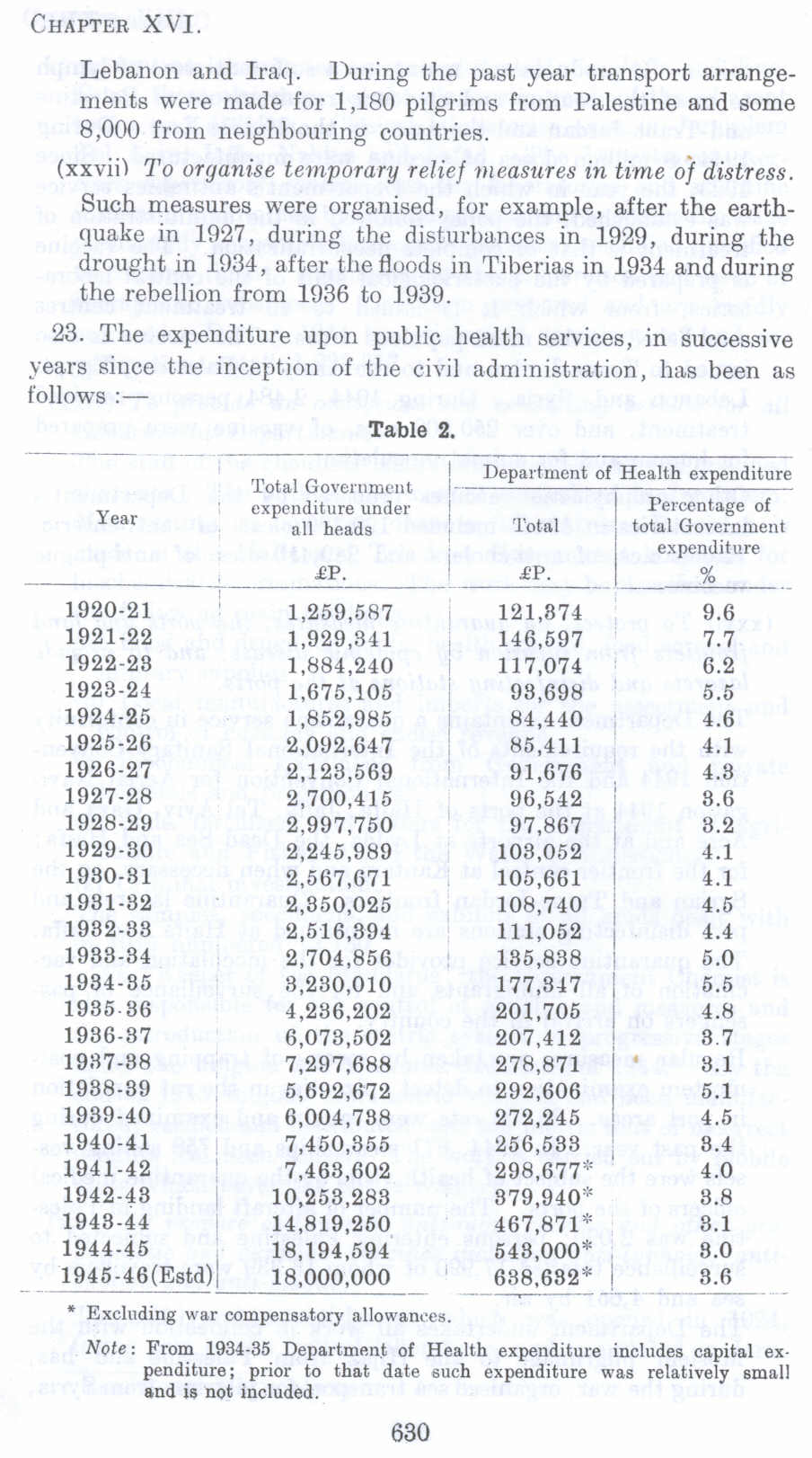 Table showing Expenditure Upon Public Health Services, 1920-1946 in Palestine before 1948 (Nakba), British Mandate: A Survey of Palestine: Volume II - Page 630. Chapter XVI: Social Services : Section 1: Health Services : (b) Particulars of Government Health Services : Table 2 |