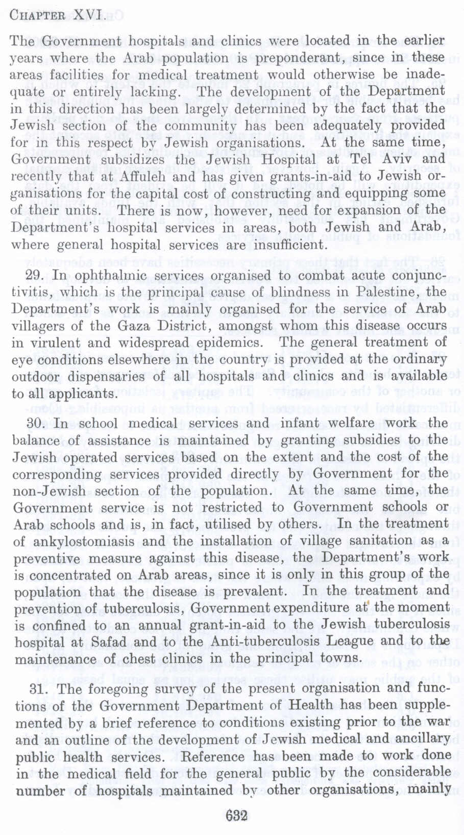 31. The foregoing survey of the present organisation and functions of the Government Department of Health has been supplemented by a brief reference to conditions existing prior to the war and an outline of the development of Jewish medical and ancillary public health services. Reference has been made to work done in the medical field for the general public by the considerable number of hospitals maintained by other organisations, mainly