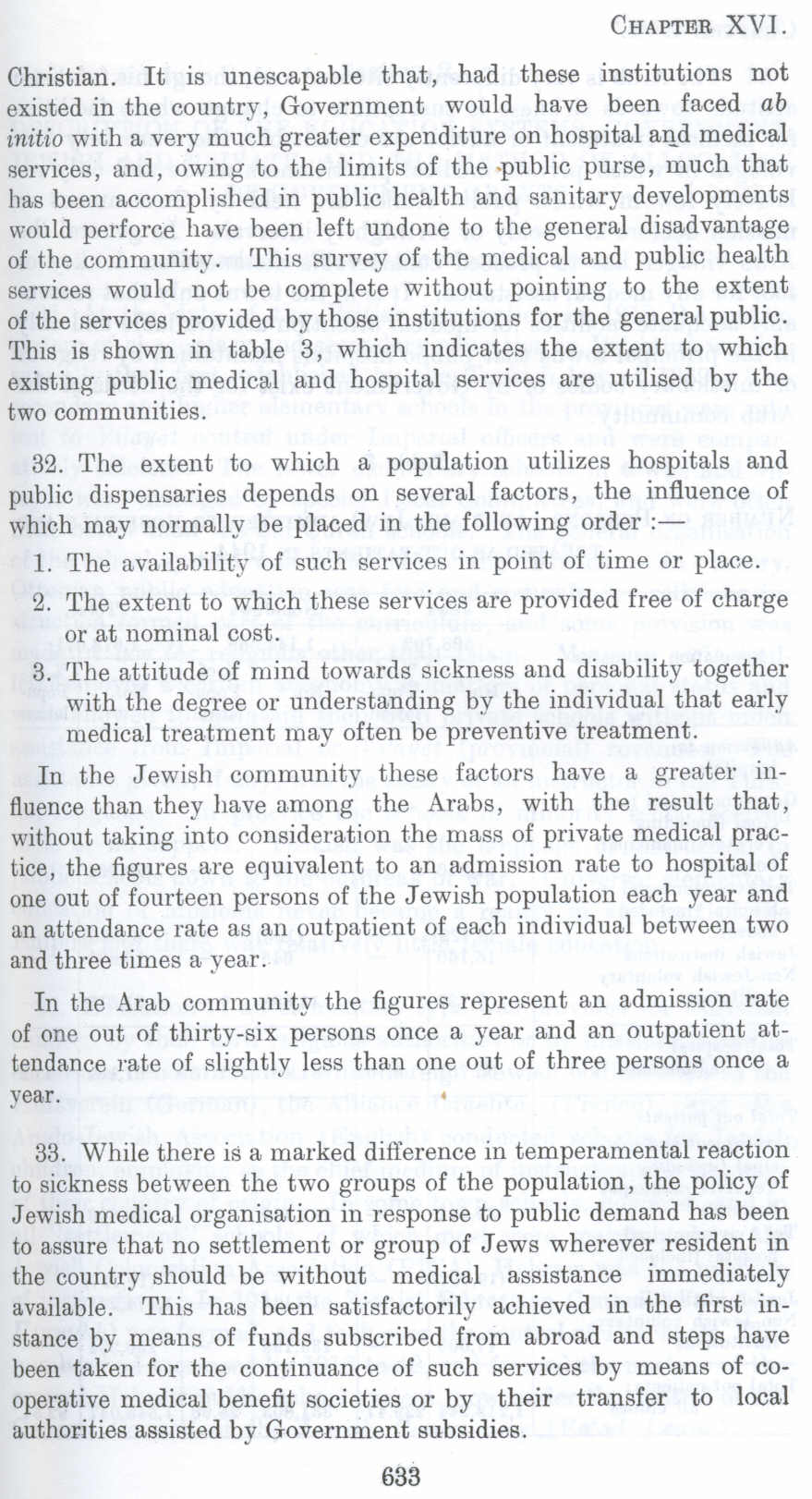 33. While there is a marked difference in temperamental reaction to sickness between the two groups of the population, the policy of Jewish medical organisation in response to public demand has been to assure that no settlement or group of Jews wherever resident in the country should be without medical assistance immediately available. This has been satisfactorily achieved in the first instance by means of funds subscribed from abroad and steps have been taken for the continuance of such services by means of cooperative medical benefit societies or by their transfer to local authorities assisted by Government subsidies.