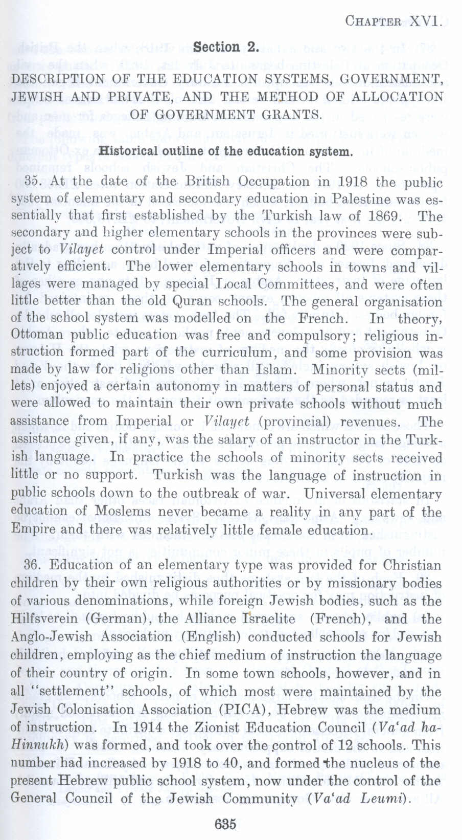 DESCRIPTION OF THE EDUCATION SYSTEMS, GOVERNMENT, JEWISH AND PRIVATE, AND THE METHOD OF ALLOCATION OF GOVERNMENT GHANTS.