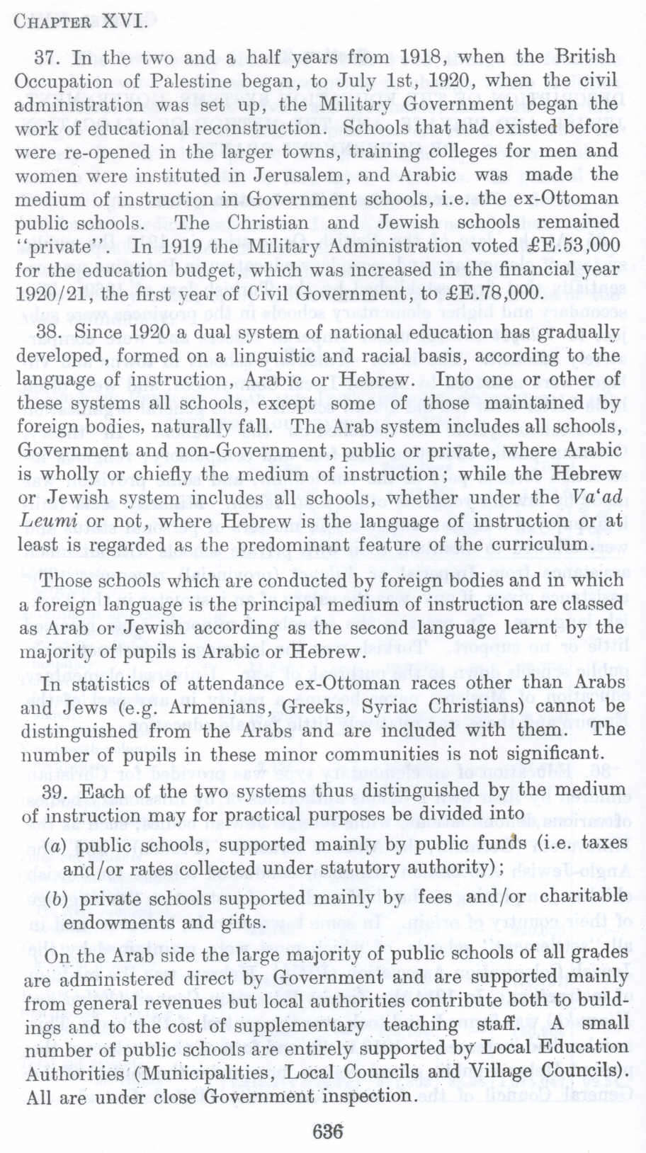 38. Since 1920 a dual system of national education has gradually developed, formed on a linguistic and racial basis, according to the language of instruction, Arabic or Hebrew. Into one or other of these systems all schools, except some of those maintained by foreign bodies, naturally fall. The Arab system includes all schools, Government and non-Government, public or private, where Arabic is wholly or chiefly the medium of instruction; while the Hebrew or Jewish system includes all schools, whether under the Va'ad Leumi or not, where Hebrew is the language of instruction or at least is regarded as the predominant feature of the curriculum.